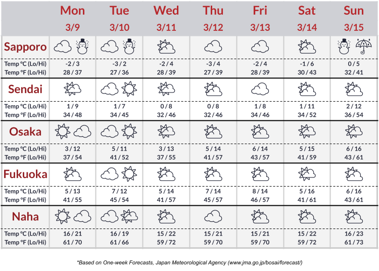 Temperatures will vary widely by region, ranging from chilly conditions in the north (Sapporo) to mild spring weather in central areas like Tokyo, and warmer temperatures in the south around Naha.