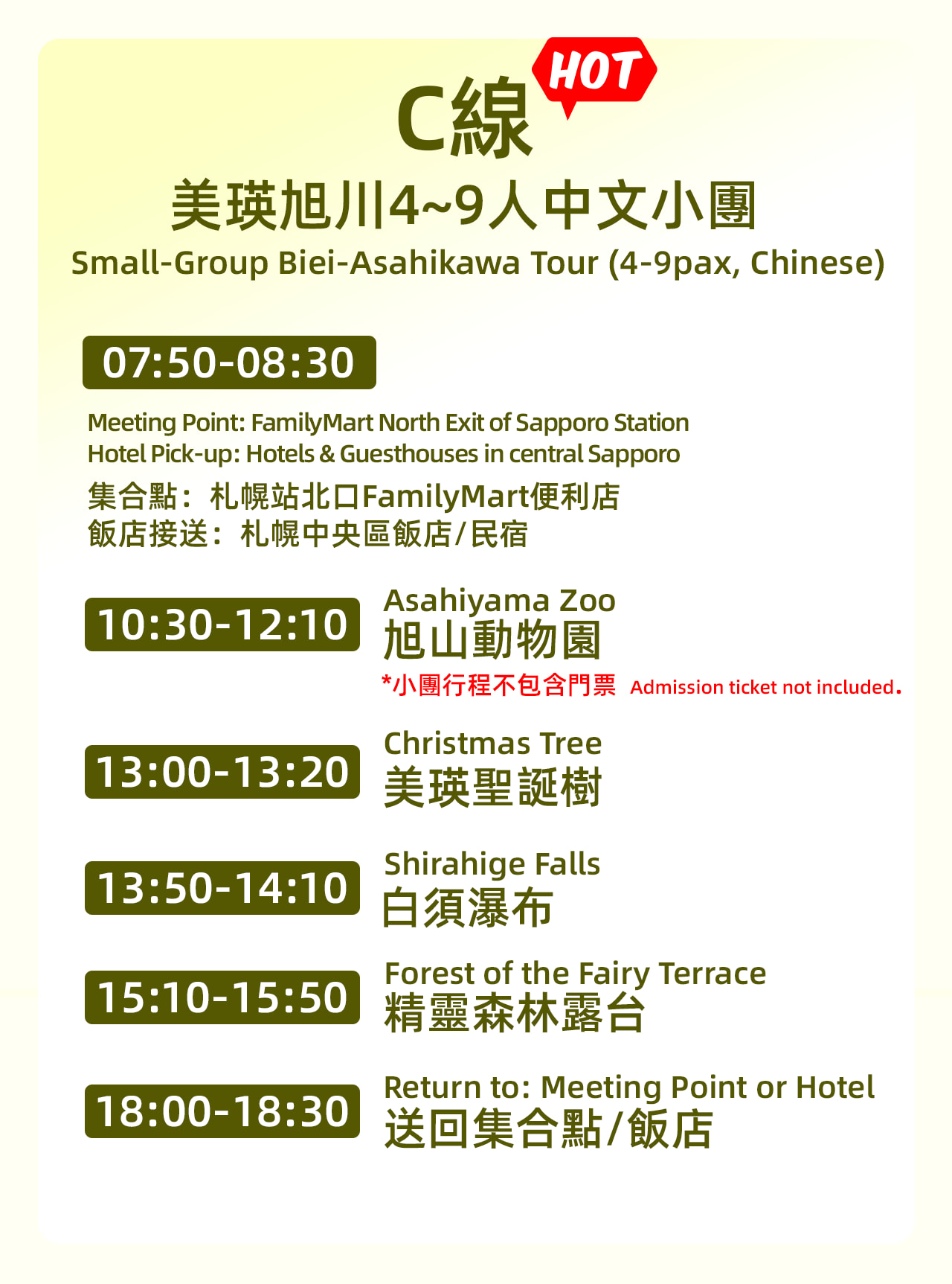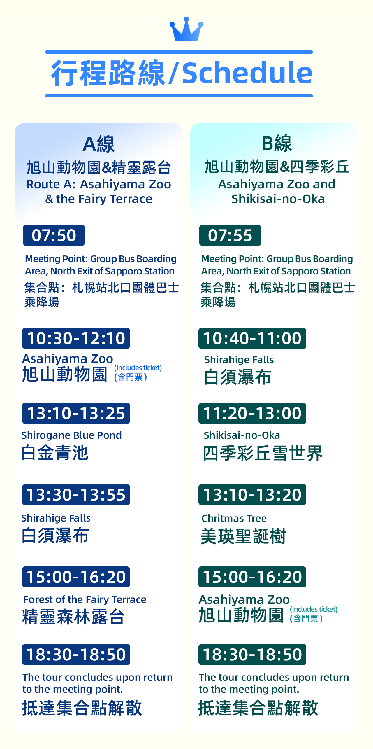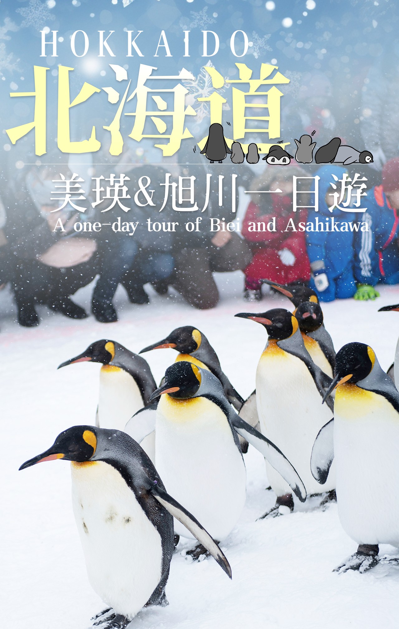 **Winter Limited! Hokkaido Biei & Asahikawa Day Trip, three routes to enjoy the winter snow country. The adorable penguin parade will start in mid-December, with two shows daily. Sign up for a day trip to watch!** * [A] Bus Tour Line A: Hokkaido Asahikawa Zoo & Ningle Terrace Bus Day Trip | Bilingual Guide in Chinese and English | Includes Asahiyama Zoo Ticket. (Attractions: Asahiyama Zoo | Blue Pond | Shirahige Falls | Ningle Terrace) * [B] Bus Tour Line B: Hokkaido Asahikawa Zoo & Shikisai-no-oka Bus Day Trip | Bilingual Guide in Chinese and English | Includes Asahiyama Zoo Ticket. (Attractions: Asahiyama Zoo | Shikisai-no-oka | Shirahige Falls | Biei Christmas Tree) * [C: Popular Small Group 4~9] Hokkaido Asahikawa Waterfall Small Group Tour | Hotel Pickup and Drop-off Available | Chinese Service Only (Attractions: Asahiyama Zoo | Ningle Terrace | Shirahige Falls | Biei Christmas Tree) Hokkaido Biei Asahikawa Day Trip in winter, take you to experience the dual charm of the ice and snow world. Visit Asahiya