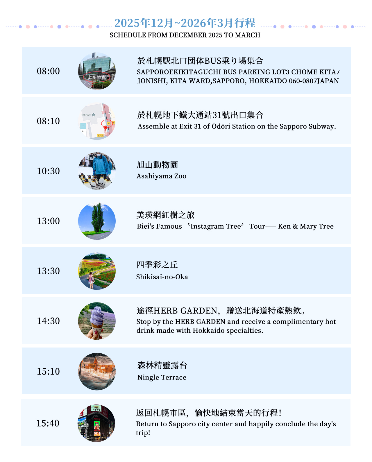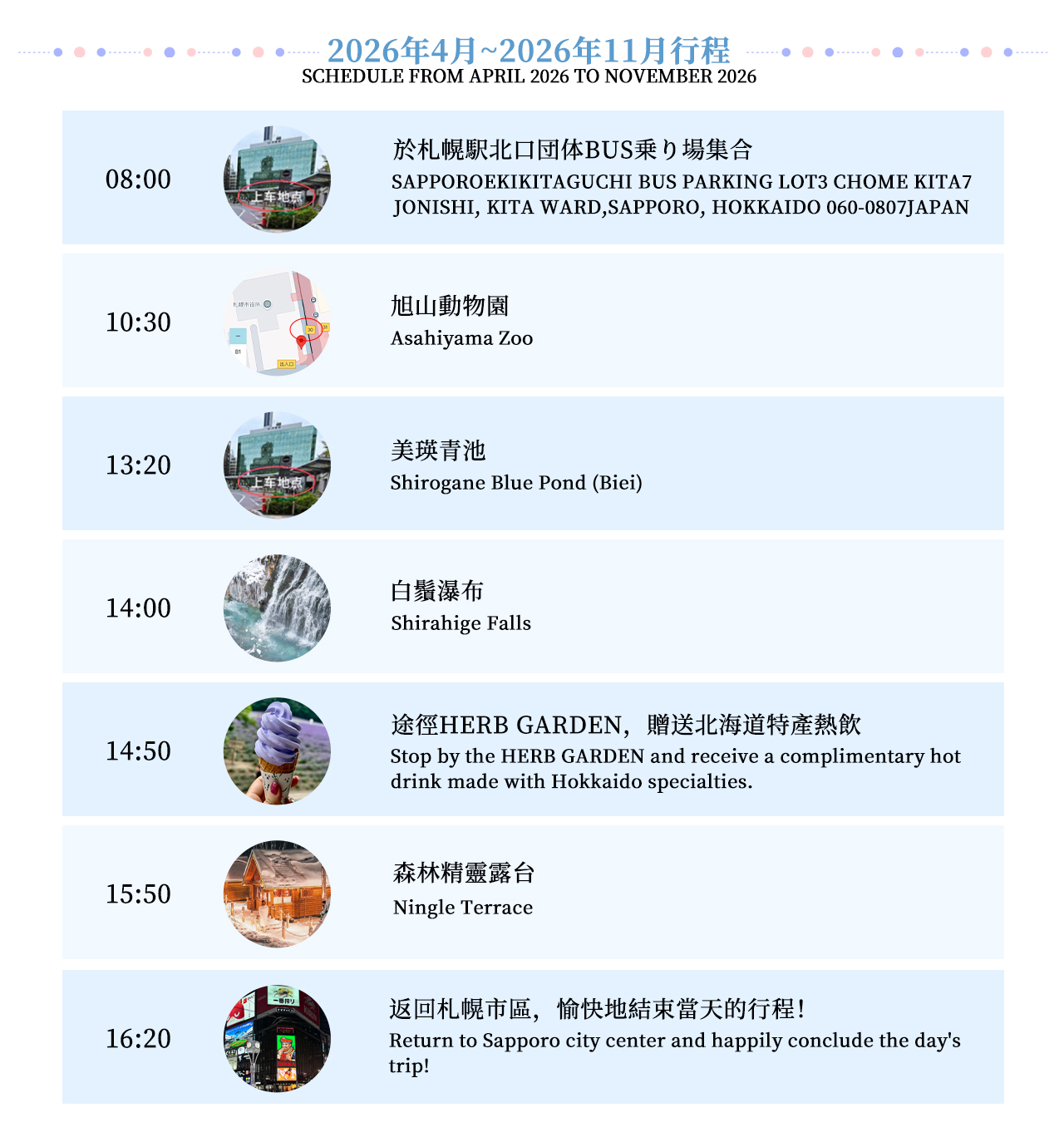 # No need to wait for the season! One-click start to Hokkaido's year-round highlights from Sapporo: ## Winter Limited (December to March): Asahiyama Zoo (ticket included) to see penguins waddling in the snow, a drive to the Biei Instagram-worthy trees, a stroll on the dreamy Ningle Terrace, snow activities at Shikisai-no-oka, full of winter charm! ## Fairyland in Spring, Summer and Autumn (April to November): Interact with the same adorable animals at the zoo, chase the cobalt blue pond and Shirahige Falls in Biei, find handmade treasures at Ningle Terrace, or replace it with a platinum hot spring if it's closed. ## Enjoy the romance of northern countries in different seasons without any planning or transportation! # [Itinerary Change Instructions (Important)] **1. Winter Tour (December to March of the following year)** Asahiyama Zoo Closed Dates: December 30, 2025 to January 1, 2026. Alternative itinerary for closed days: Biei Instagram Tree (30 minutes) → Biei Blue Pond (30 minutes) → Shirahige Falls (