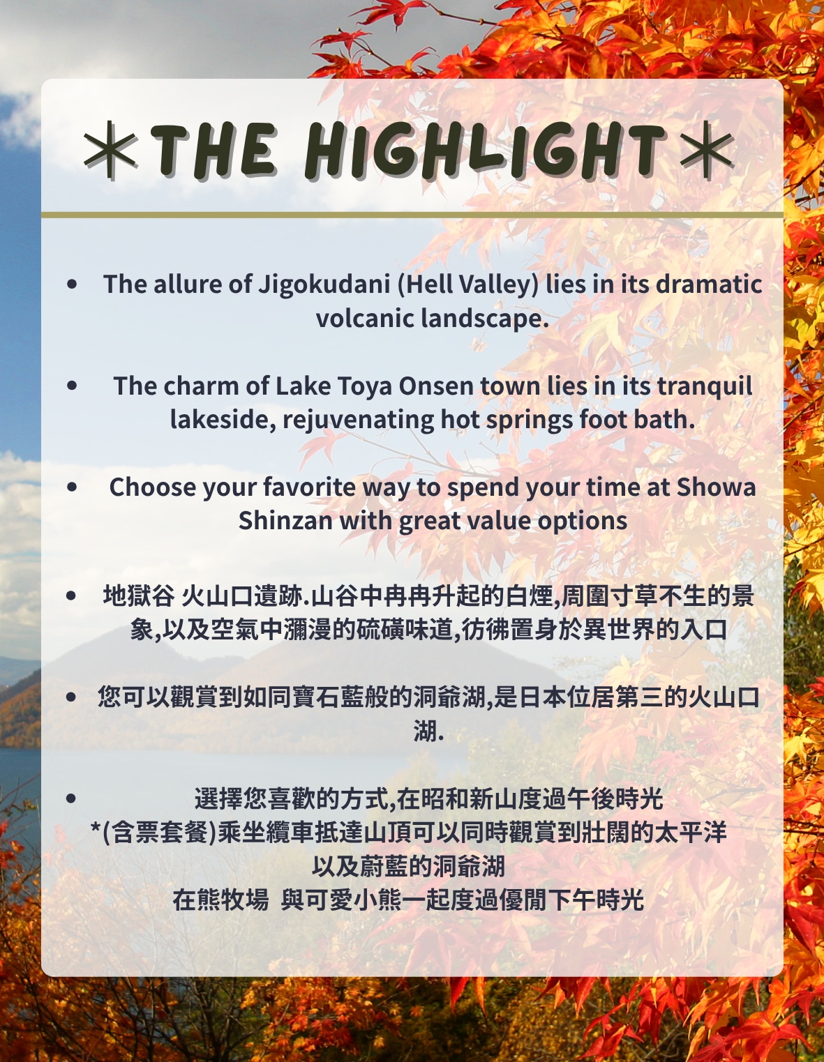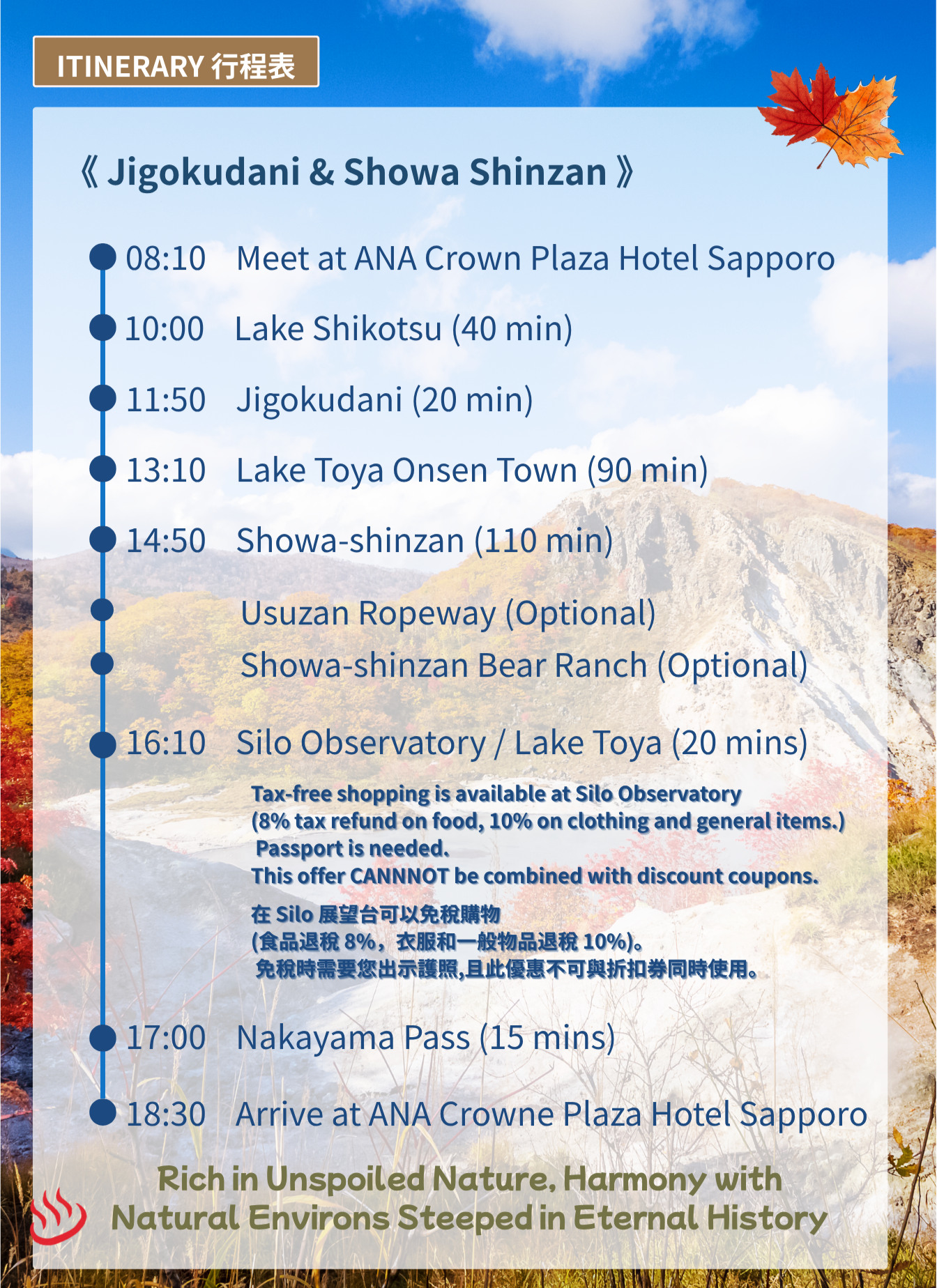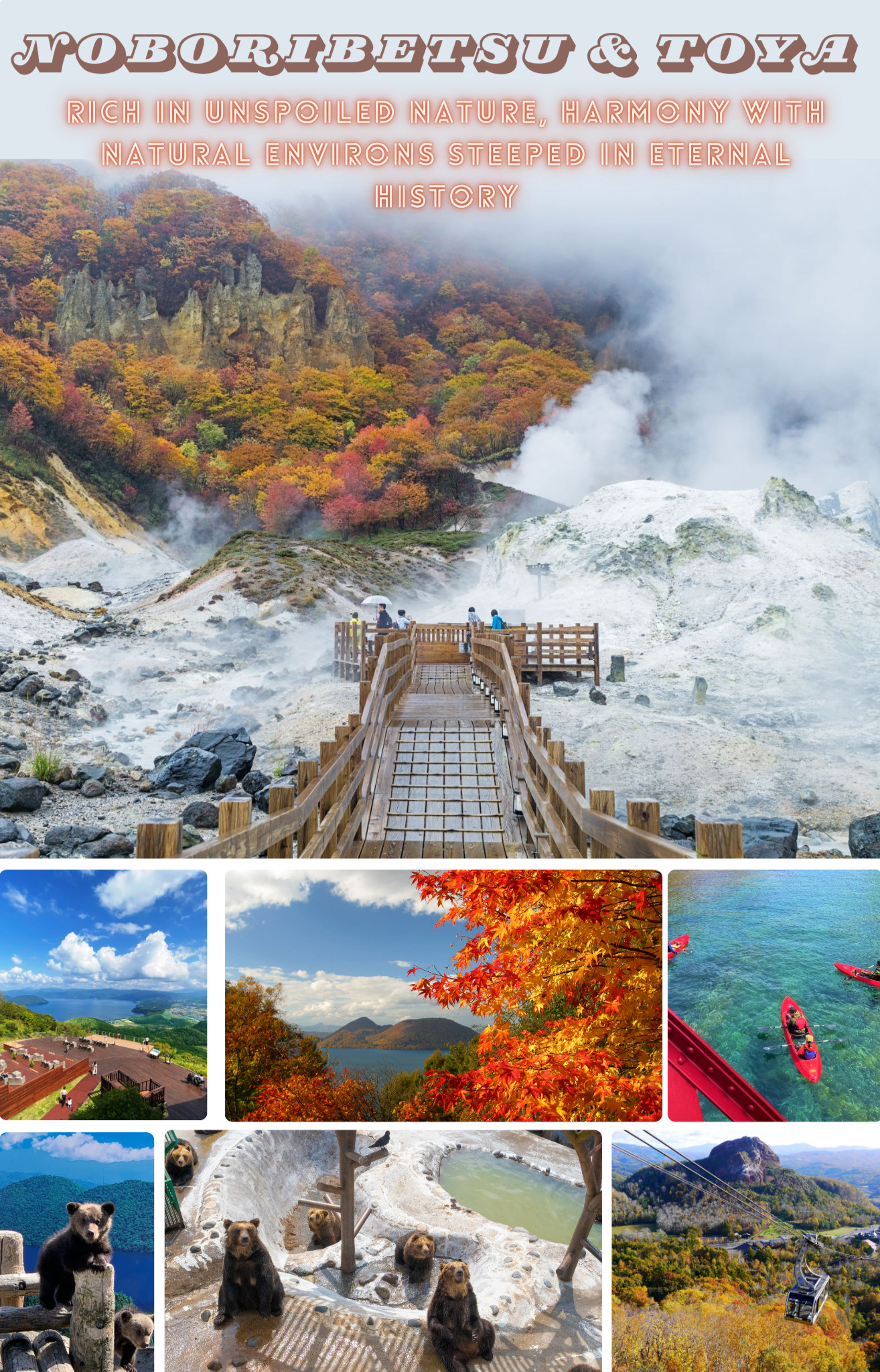 **Jigokudani & Showa Shinzan Plan** Discover geothermal Noboribetsu Jigokudani (Hell Valley). Relax at Lake Toya Onsen Town with a foot bath. Explore volcano Showa Shinzan (ropeway & bear ranch optional). Enjoy Lake Toya views from Silo Observatory (or Nakayama Pass in winter).