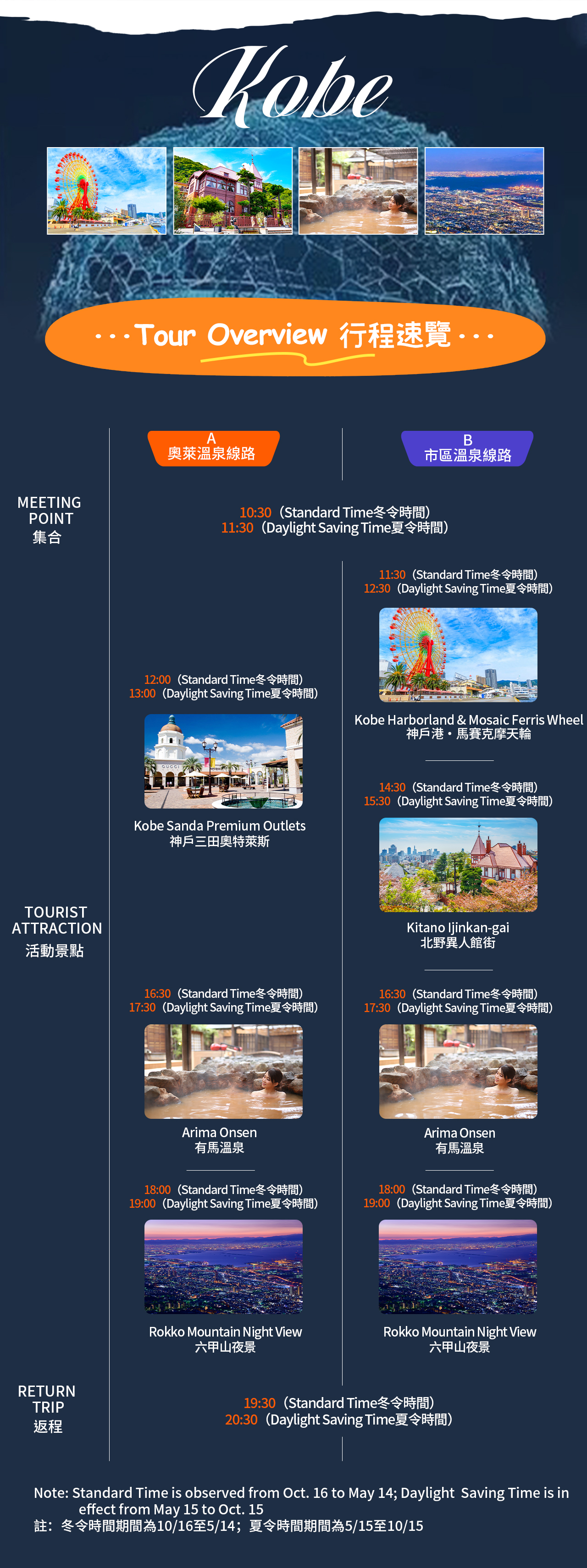 ⏰ **Please note: Departure times vary depending on the season.** * ❄️ Winter Time (October 16 - May 14 of the following year): Departure time is 10:30 AM (Japan Time) * ☀️ Summer Time (May 15 - October 15): Departure time is 11:30 AM (Japan Time) --- ✨ **This activity offers two carefully selected tour routes to meet different needs:** --- 1️⃣ Kobe Premium Outlet & Arima Onsen Route