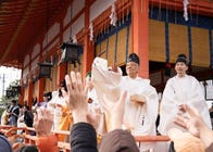 During the New Year season, Kyoto’s shrines are filled with visitors making their first prayers of the year. One highlight is the grand festival held from January 8 to 12 at Kyoto Ebisu Shrine in Gion, one of Japan’s three major Ebisu shrines. On January 9, a lively parade called the Hoe Kago Procession travels from Uzumasa to the shrine. On January 10, film actresses present lucky bamboo branches, followed by maiko offering “fukuzasa” branches or “fuku mochi” rice cakes on January 11, bringing festive energy to the winter streets.