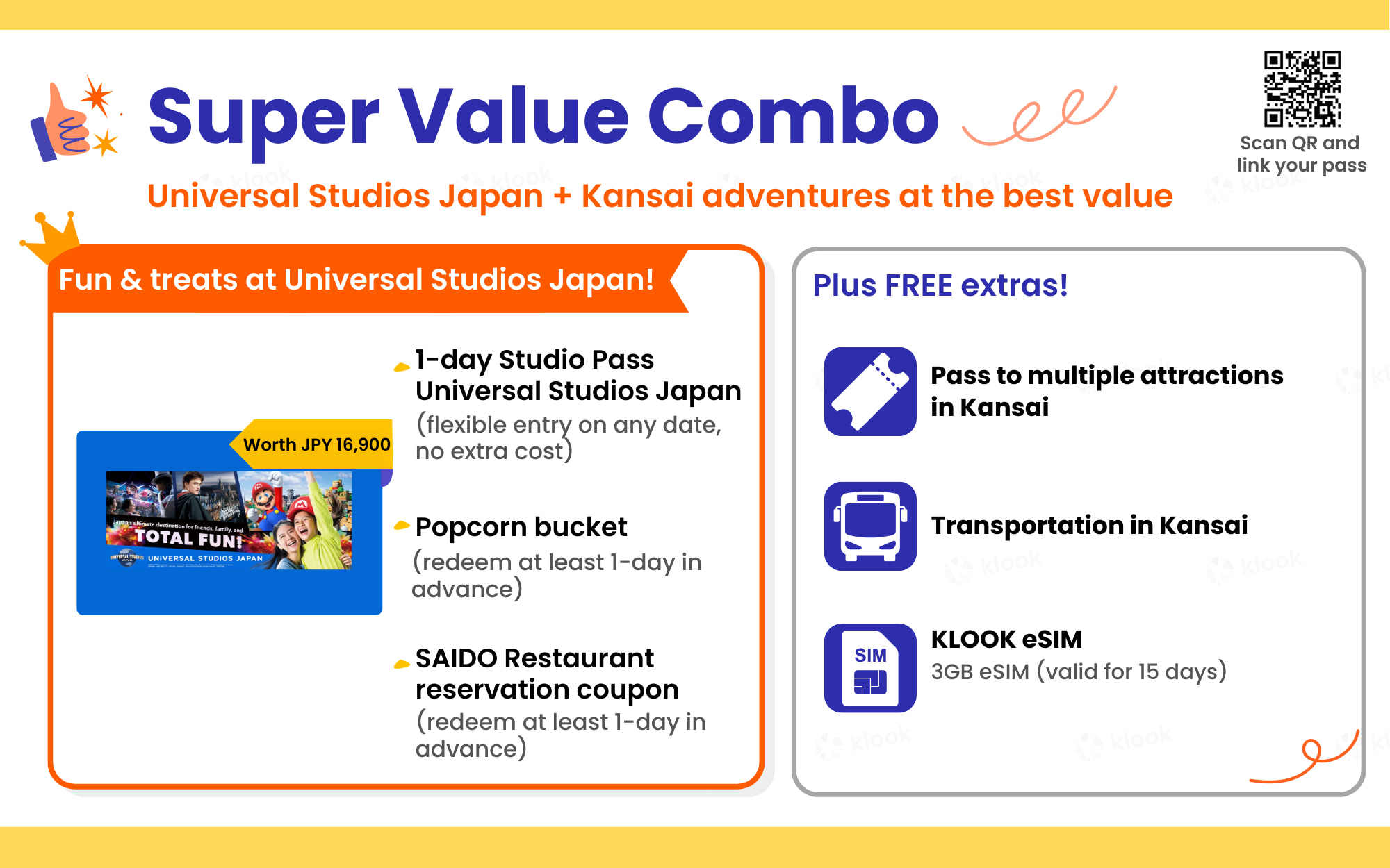 - * **Multiple premium options:** Universal Studios Japan, Super Star popcorn bucket, 1-day JR Kansai Area Pass, Kyoto Hop-On Hop-Off Sightseeing Bus Ticket and more!