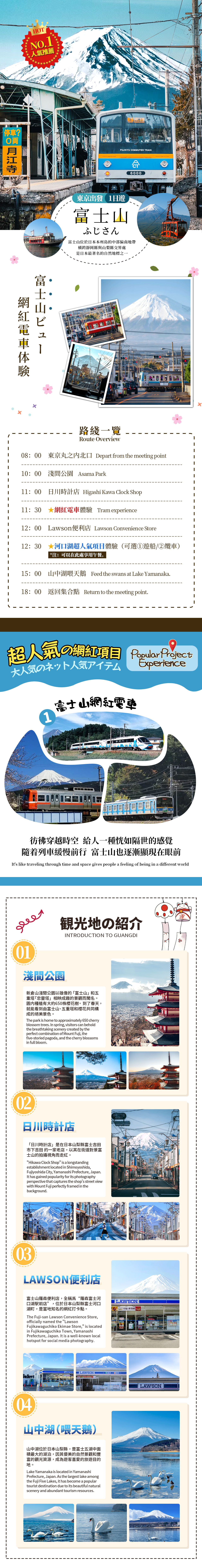# Healing Little Train Experience: Ride a cute, slow-paced little train and enjoy the scenery along the way of Mt. Fuji. * See Mt. Fuji from multiple perspectives: Mountain views, lake views, cable cars, and the Tenseimaru pleasure boat offer panoramic views of Mt. Fuji from multiple angles. * Popular spot in the ladder town: Experience the unique neighborhood atmosphere at the foot of Mt. Fuji, perfect for taking pictures and souvenirs. * Retro Time Experience: Step into the Nikawa Clock Shop and encounter a gentle shop full of Showa atmosphere. * Internet-famous convenience store photo spot: Take limited edition travel photos of Mt. Fuji in front of the super popular Lawson. * Romantic moments feeding swans by the lake: Interact closely with white swans at Lake Yamanaka and experience a sense of natural healing. * Relaxed pace without rushing: A collection of popular experiences and natural beauty in one day, comfortable and relaxing, allowing for photos and relaxation.