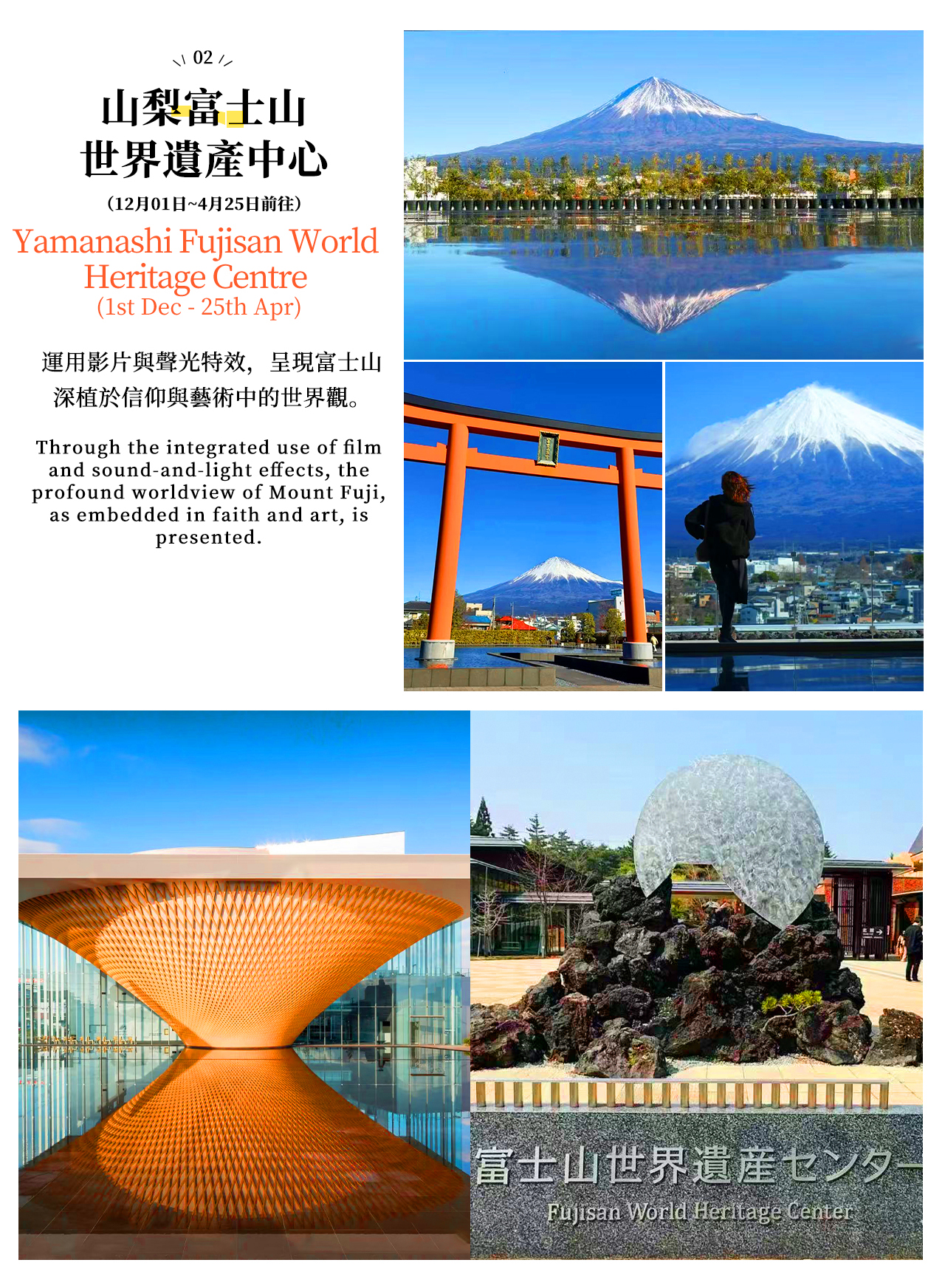 - * Mt. Fuji 5th Station: Admire the majestic view of Mt. Fuji up close and check out the Mt. Fuji World Heritage Center.