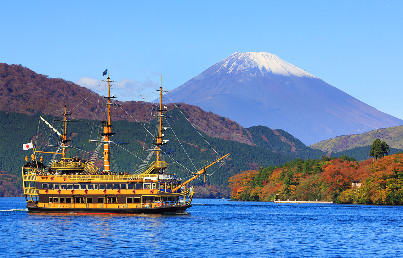 - * Lake Ashi Pirate Ship Tour: Enjoy a cruise on the lake, overlooking Mt. Fuji and the torii gate on the water, a picturesque landscape.