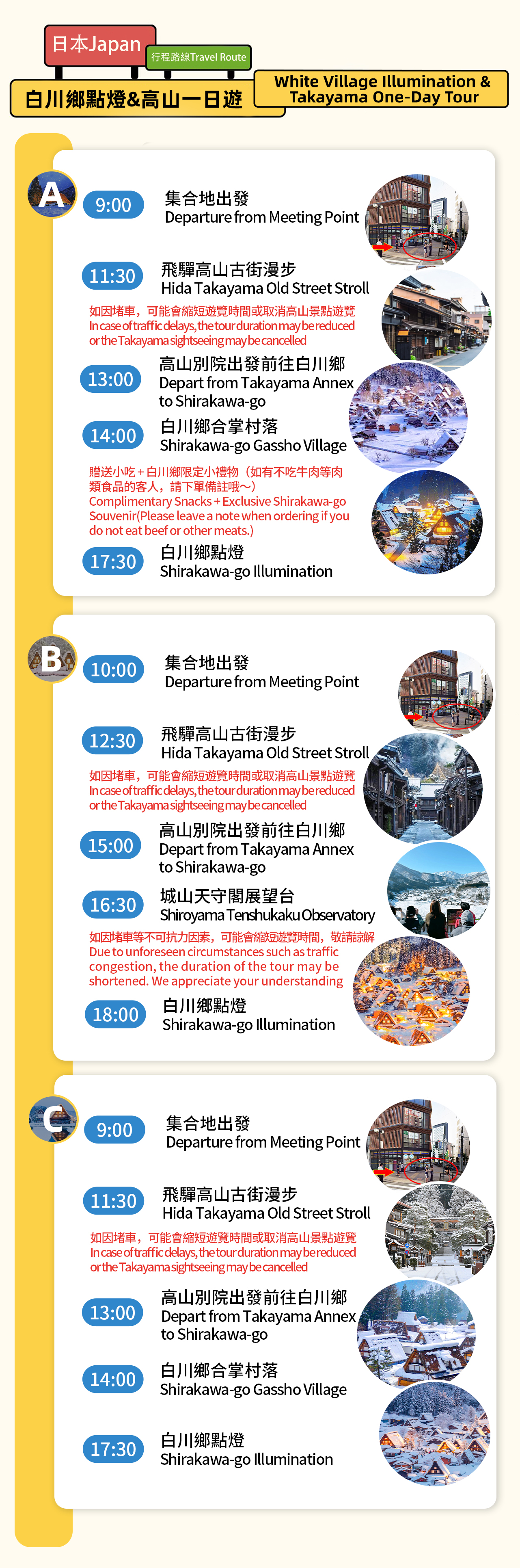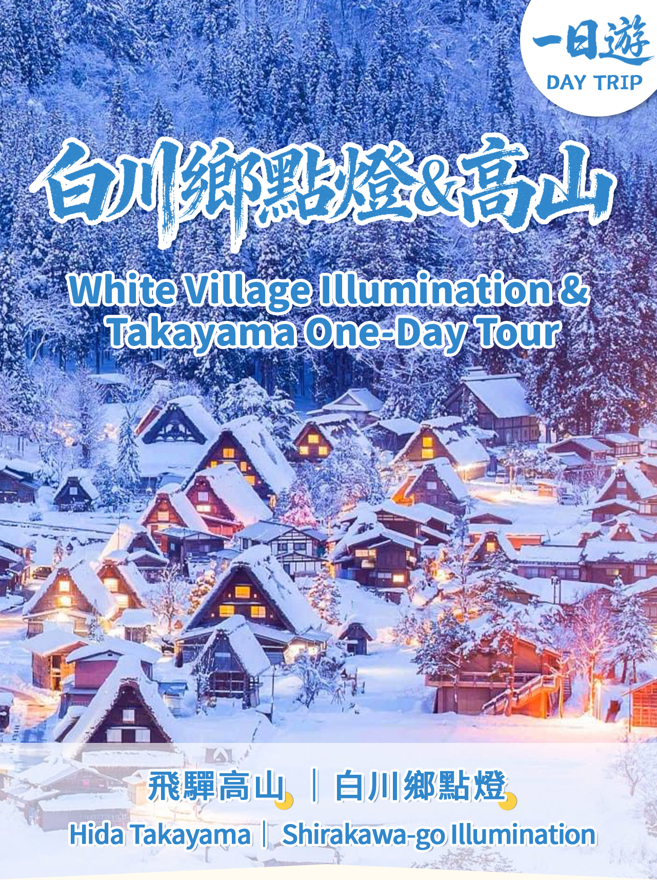 - The Shirakawa-go Light-Up is Japan's most magical winter spectacle, open to the public on only four designated days each year (January 12, January 18, January 25, and February 1 in 2026). For four short nights, tourists from all over the world flock here, making tickets and slots hard to come by. On these rare nights, the snow-covered gassho-style village is lit up by twinkling lights, as if time has stopped in a fairytale world. Witnessing this scene with your own eyes is not only a travel memory, but also an unforgettable winter night miracle. This tour departs from Nagoya, taking you to the old streets of Takayama, the "Little Kyoto of Hida", during the day, and arriving at Shirakawa-go in the evening to enjoy the light-up. There is no need to worry about reservations and transportation, as the entire trip is accompanied by bilingual (Chinese/English) guides, allowing you to easily grasp this precious experience that only happens four days a year. - Pre-trip notice: We will send the guide and vehicle