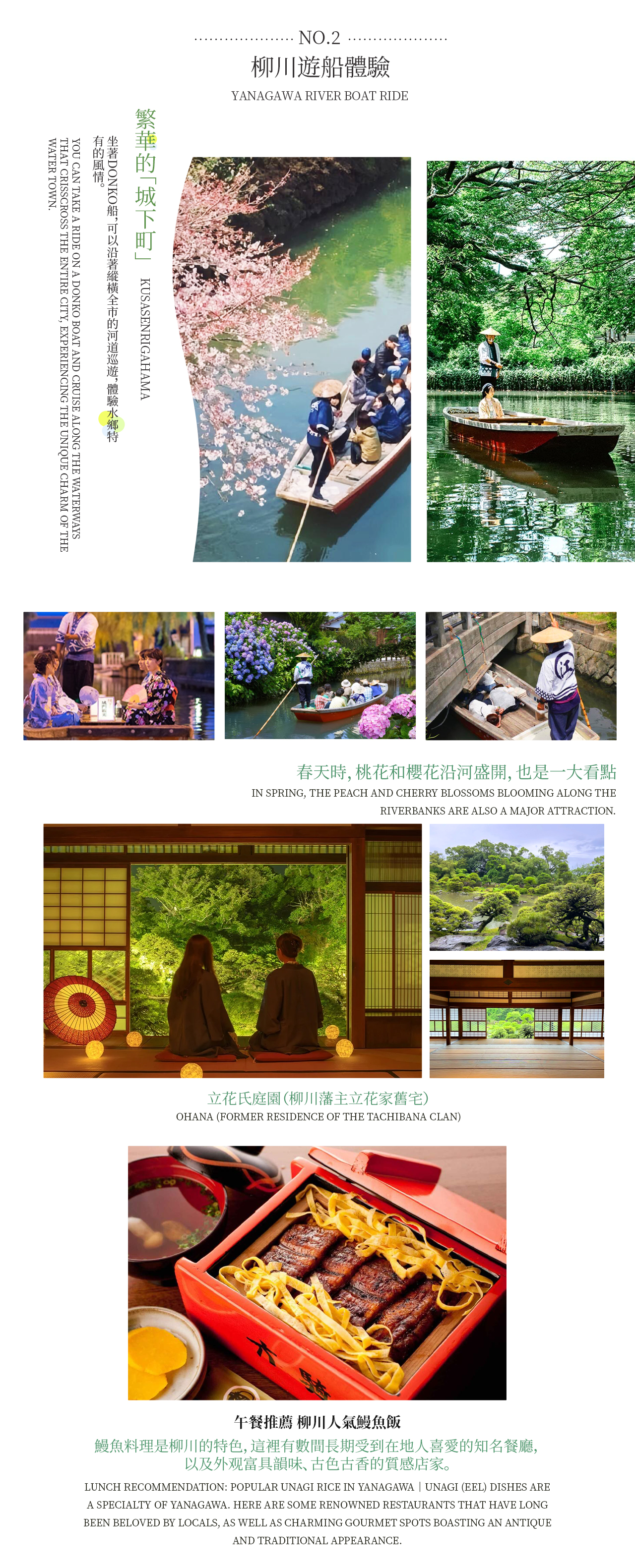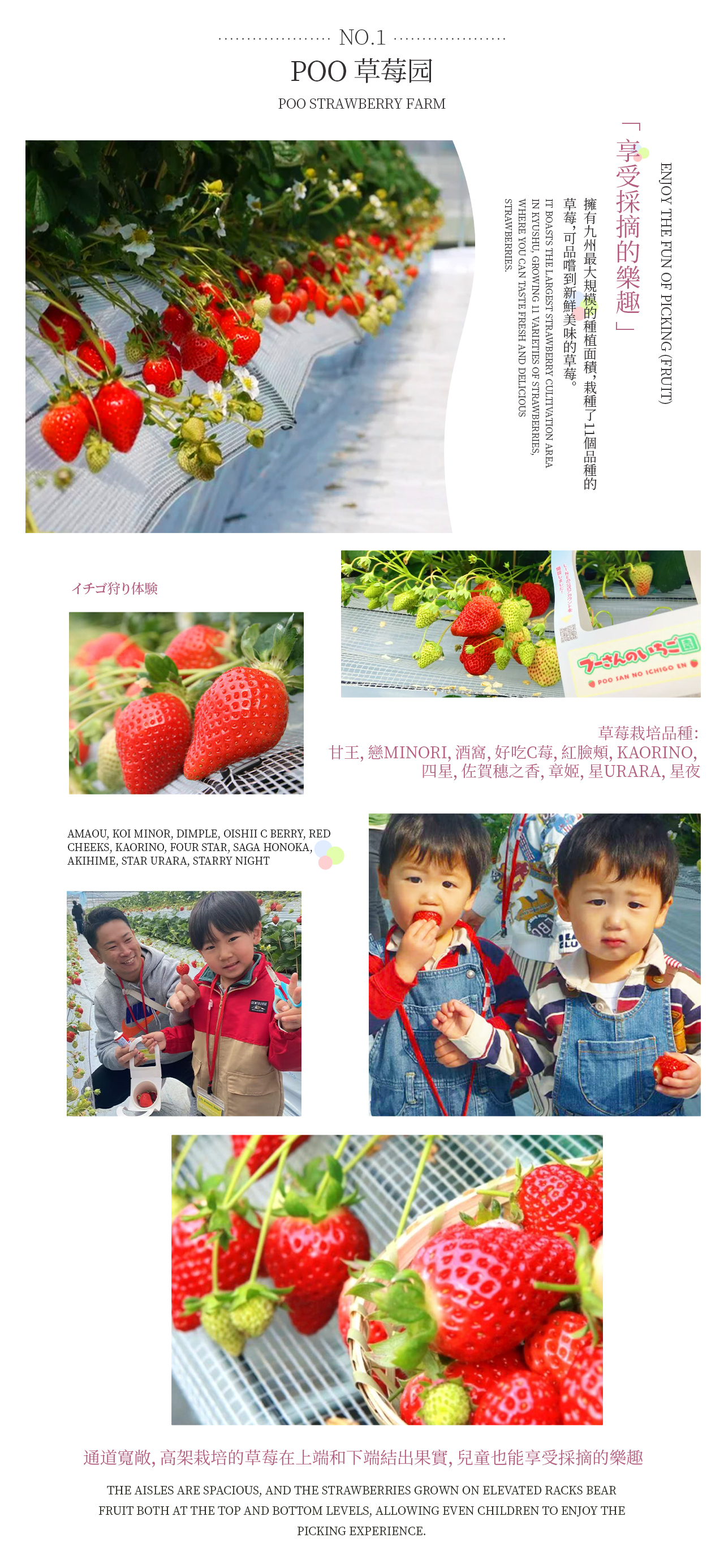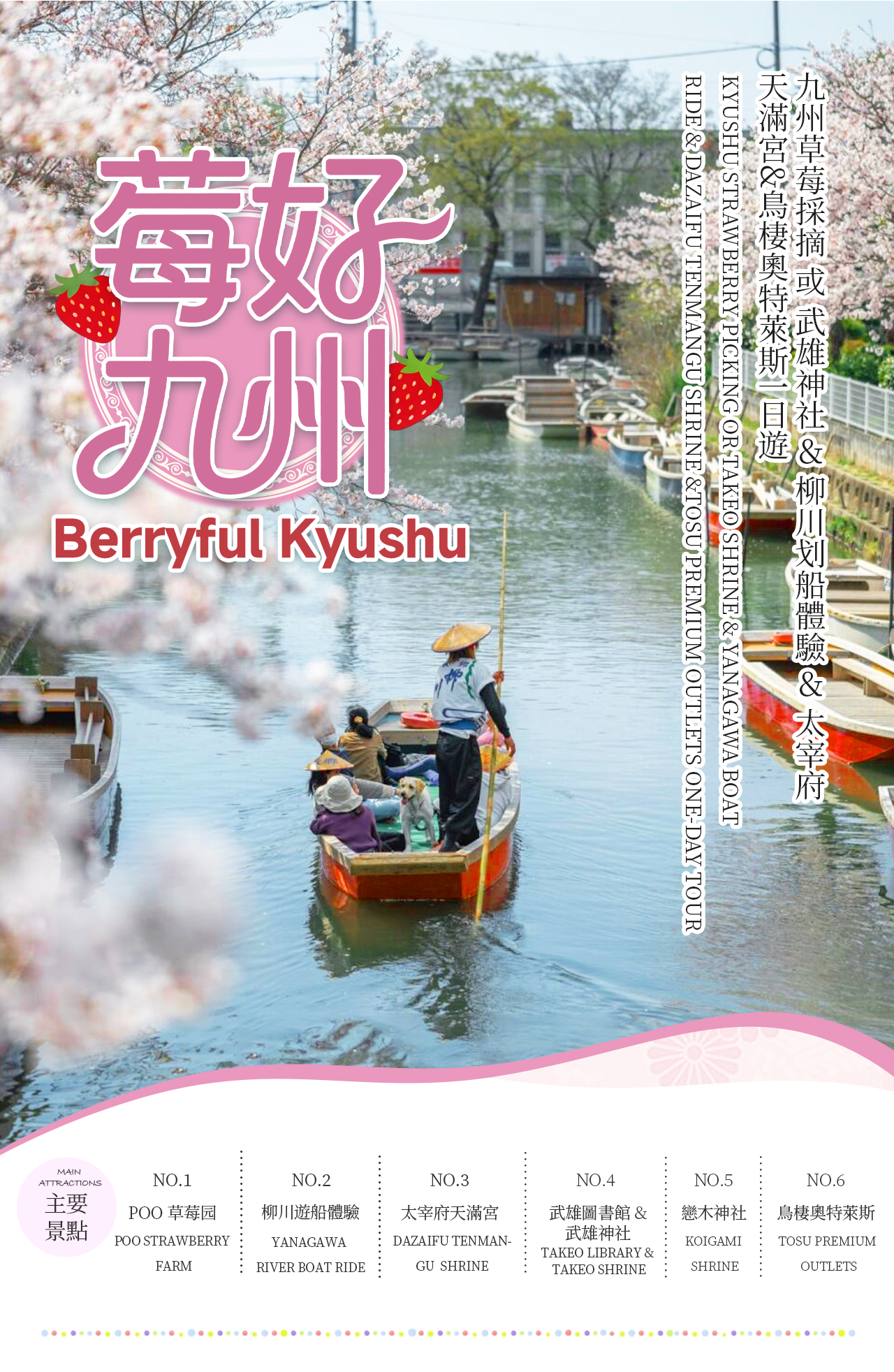 - * All-you-can-eat strawberries (January-April): Enjoy picking and eating popular sweet strawberries such as "Beniippee" and "Aiminori." * Must-do in Yanagawa: Traditional punt boat tour: Travel through the ancient water town on a small boat and admire the Edo-style river scenery. * Popular spot: Dazaifu Tenmangu Shrine visit: Kyushu's most popular god of learning, pray for career and exam success, and find many local foods and souvenirs. * Limited to non-strawberry season: Visit Takeo's healing spots * Takeo Shrine: Full of power from the great camphor tree * Takeo Library: A popular spot with Starbucks x Library * Koikoi Shrine: A rare "love prayer shrine" in Japan, full of girlish charm * Comfortable travel: Depart from Fukuoka, with assistance from Chinese-speaking staff, making your trip easy and stress-free.