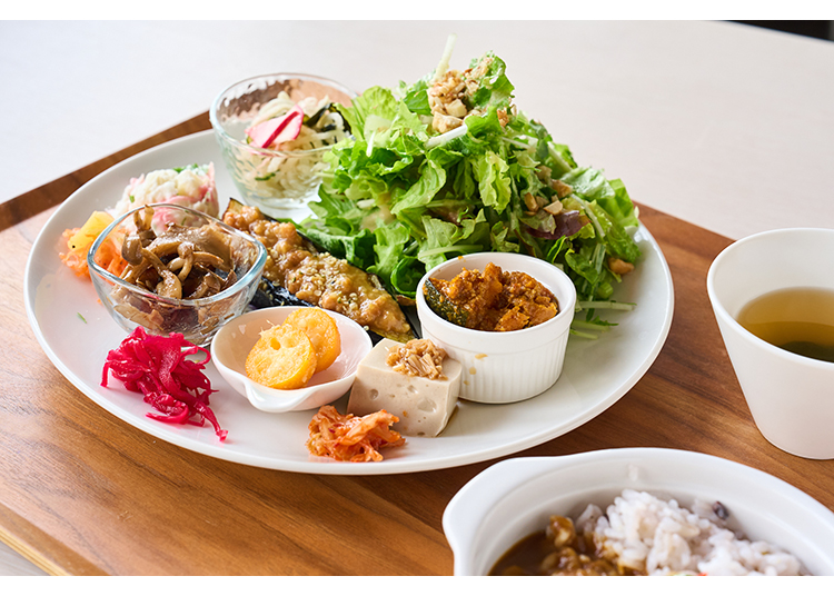 The popular weekly lunch uses 30 to 40 different ingredients, providing nearly all the vegetables needed daily. The vegetarian curry is another popular item on the menu. Instead of meat, sake lees are used to enhance the deep, rich flavor. The owner combines her knowledge with creativity to bring out the natural deliciousness of the vegetables in comforting dishes.