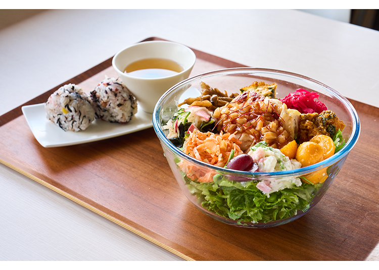 Special Gut-Friendly Salad Lunch (1,300 yen). The meal includes a generous green salad, soup, and onigiri rice balls.