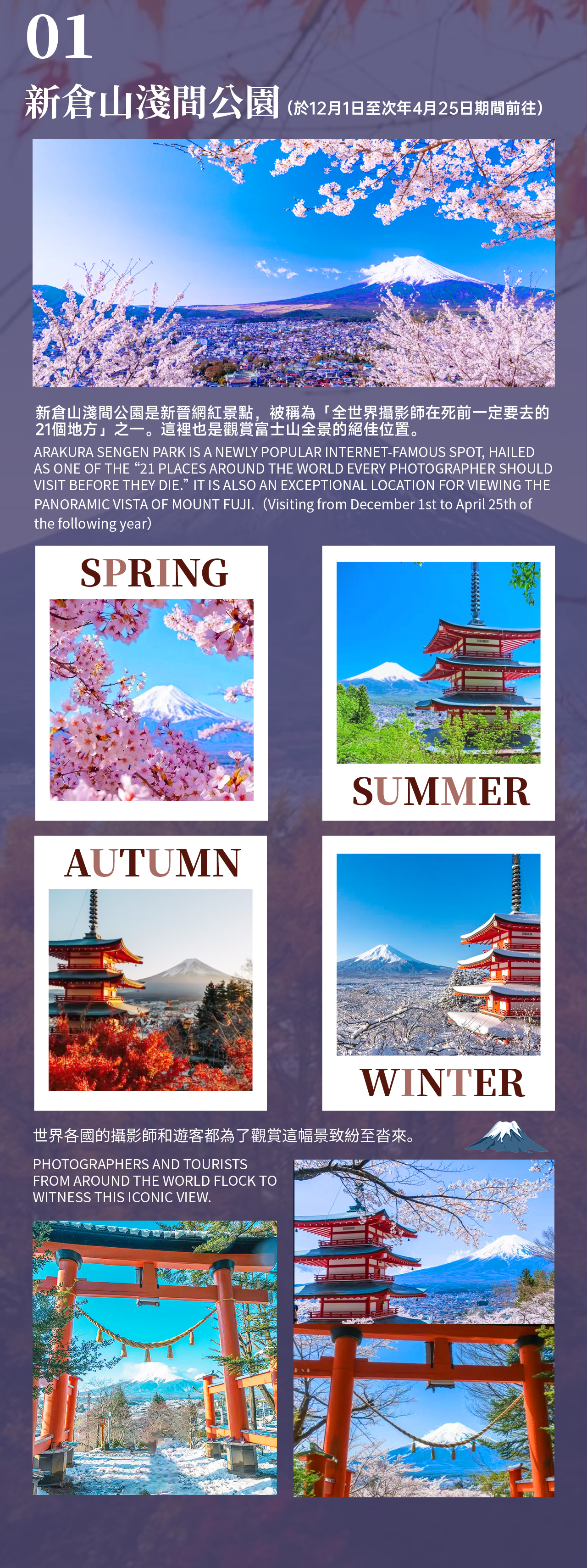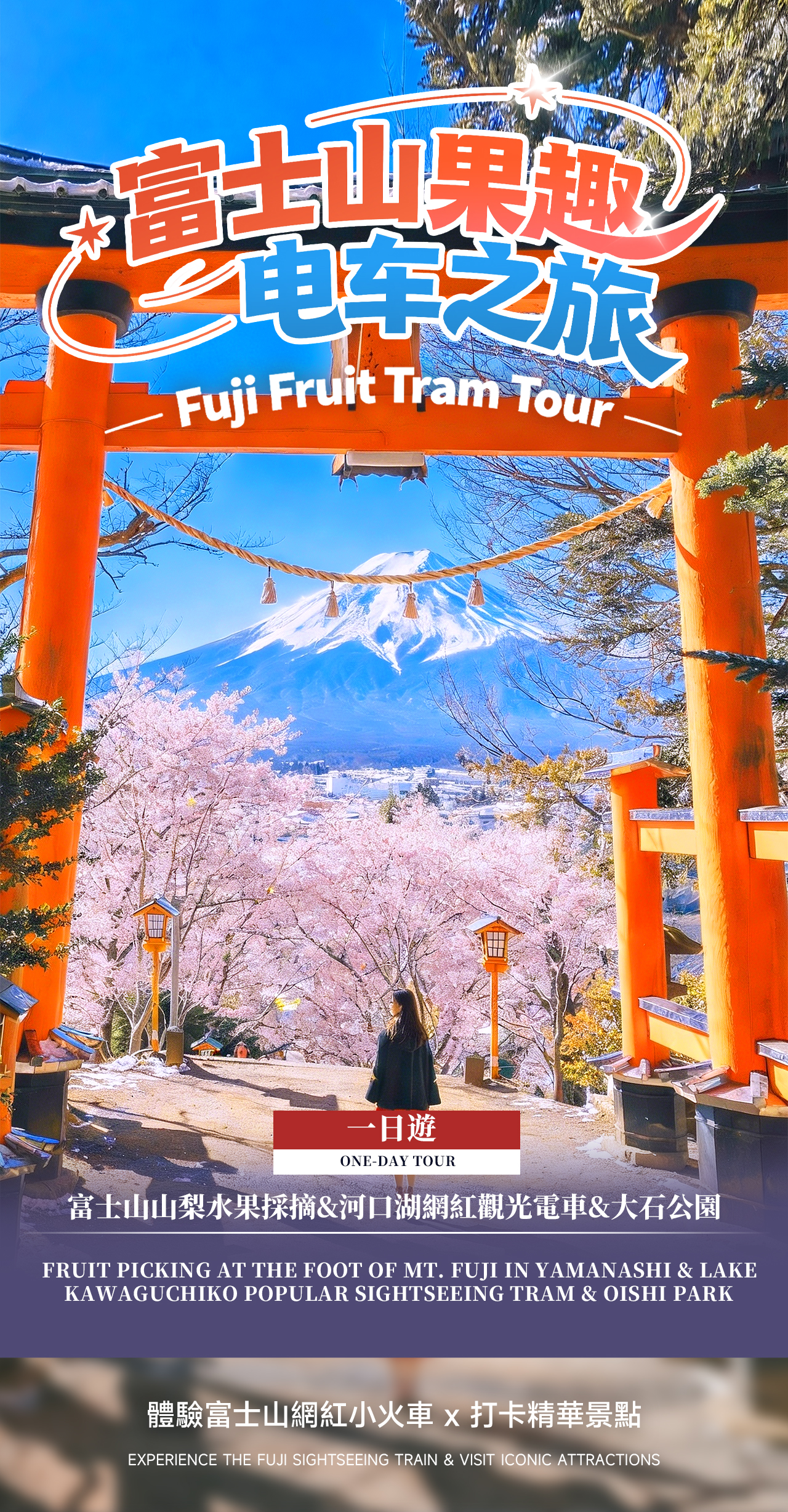 Embark on a relaxing family-friendly day trip from Tokyo. In the morning, ascend to Mount Fuji's 5th Station or the Arakurayama Sengen Park for a close-up view of the magnificent Mount Fuji. Afterward, take the popular Kawaguchiko sightseeing train, capturing the idyllic countryside and Mount Fuji scenery along the way. For lunch, you can choose a Japanese restaurant at your own expense. In the afternoon, stroll through the flower fields of Oishi Park, admiring the beautiful scenery of seasonal flowers and Mount Fuji together, and finally experience seasonal fruit picking, enjoying a relaxing family interaction and photo opportunities.