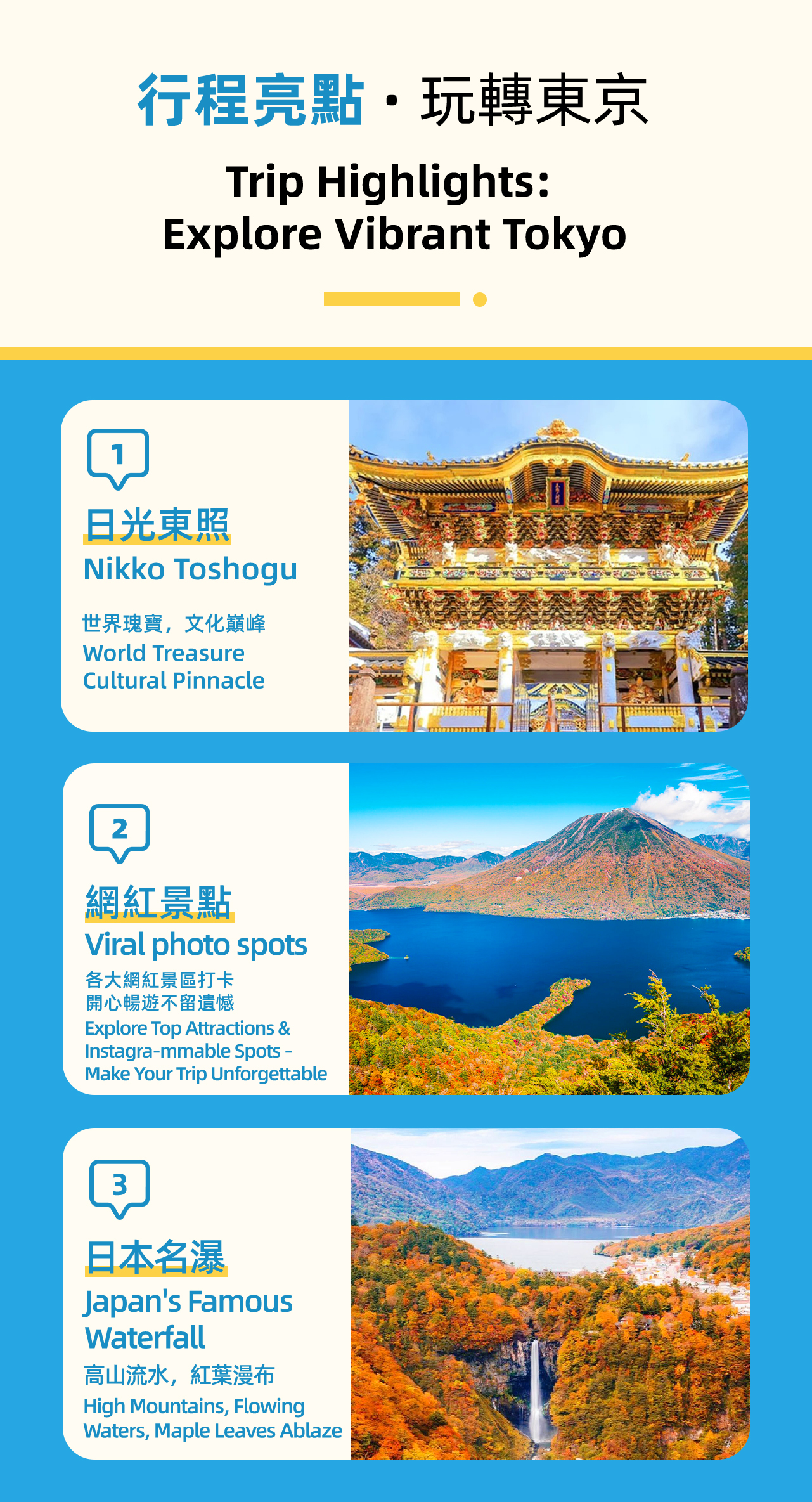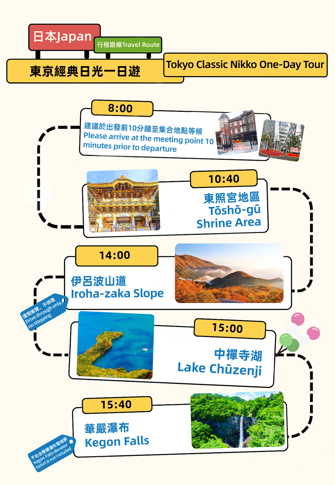 **Dear Guest, please note that November and December 2025 are peak seasons for viewing autumn leaves. To avoid the morning rush and reduce traffic delays, ensuring you fully enjoy your tour, we have moved the departure time forward by one hour. We kindly ask for your understanding and cooperation in preparing for your trip accordingly. Thank you.** **Stop 1: Toshogu Shrine** The ultimate sanctuary of Edo art, and one of Japan's most iconic historical and cultural heritage sites. From the "Three Monkeys" symbolizing wisdom (see no evil, hear no evil, speak no evil) to the "Sleeping Cat" portending peace, and further to Chinese sages and mythical auspicious beasts, this place is truly an encyclopedia of Japanese craftsmanship. Crimson halls intertwine with towering ancient cedars to create a solemn atmosphere, and the autumn foliage paints the gold leaf in breathtaking hues. **Stop 2: Irohazaka Winding Road (Drive-through, no stops)** Japan's legendary winding road. Named for its 48 hairpin turns correspondin