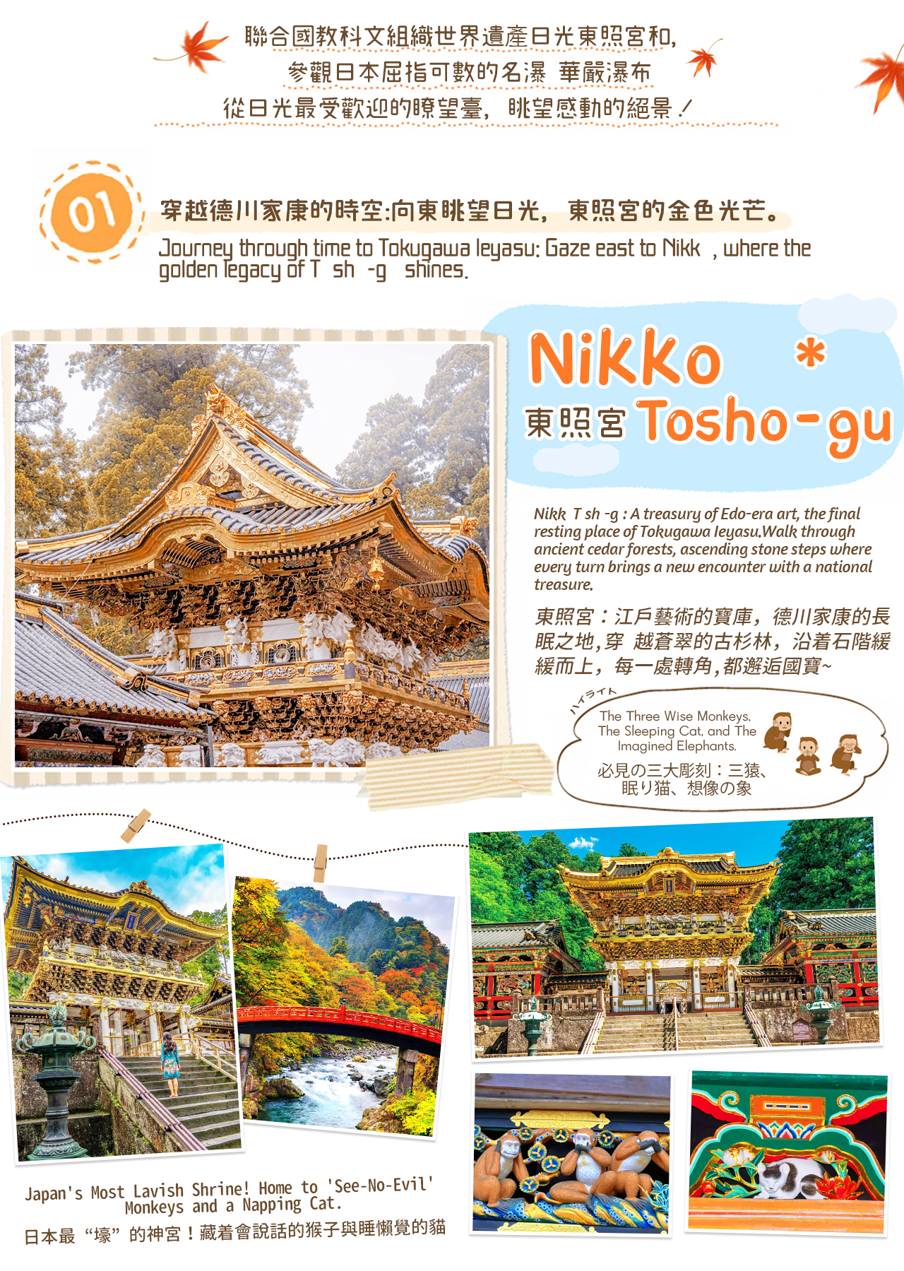 Explore the ancient charm of Toshogu Shrine and stroll through the poetic scenery of the Irohazaka Winding Road. Revisit the tranquility of Lake Chuzenji and listen to the roaring symphony of Kegon Falls. This is a journey through time, waiting for you to join us for a literary and natural feast!