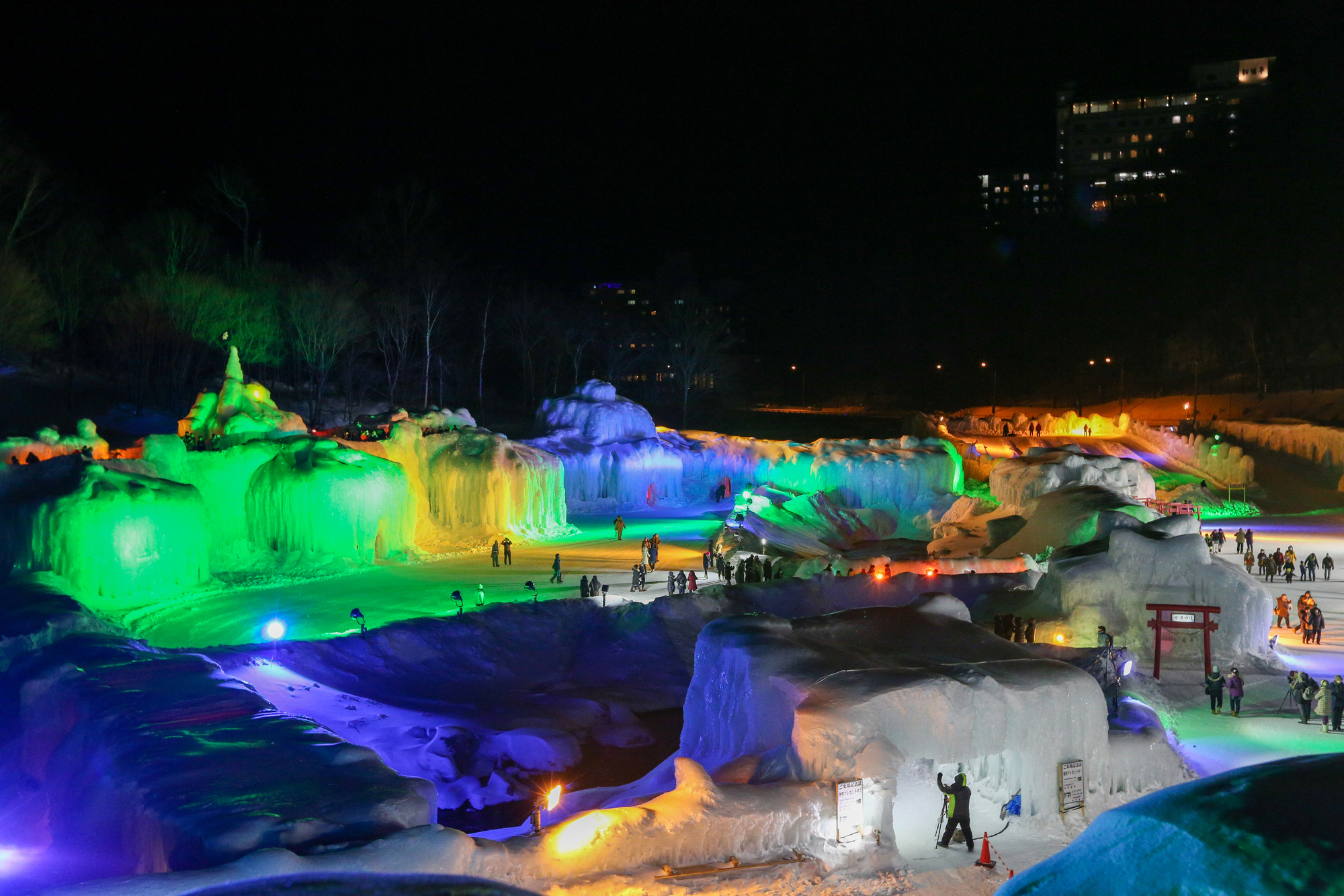 - ,* 層雲峡氷瀑まつりを訪れ、ライトアップされた絢爛な氷の彫刻と夢幻的な雪景色を鑑賞