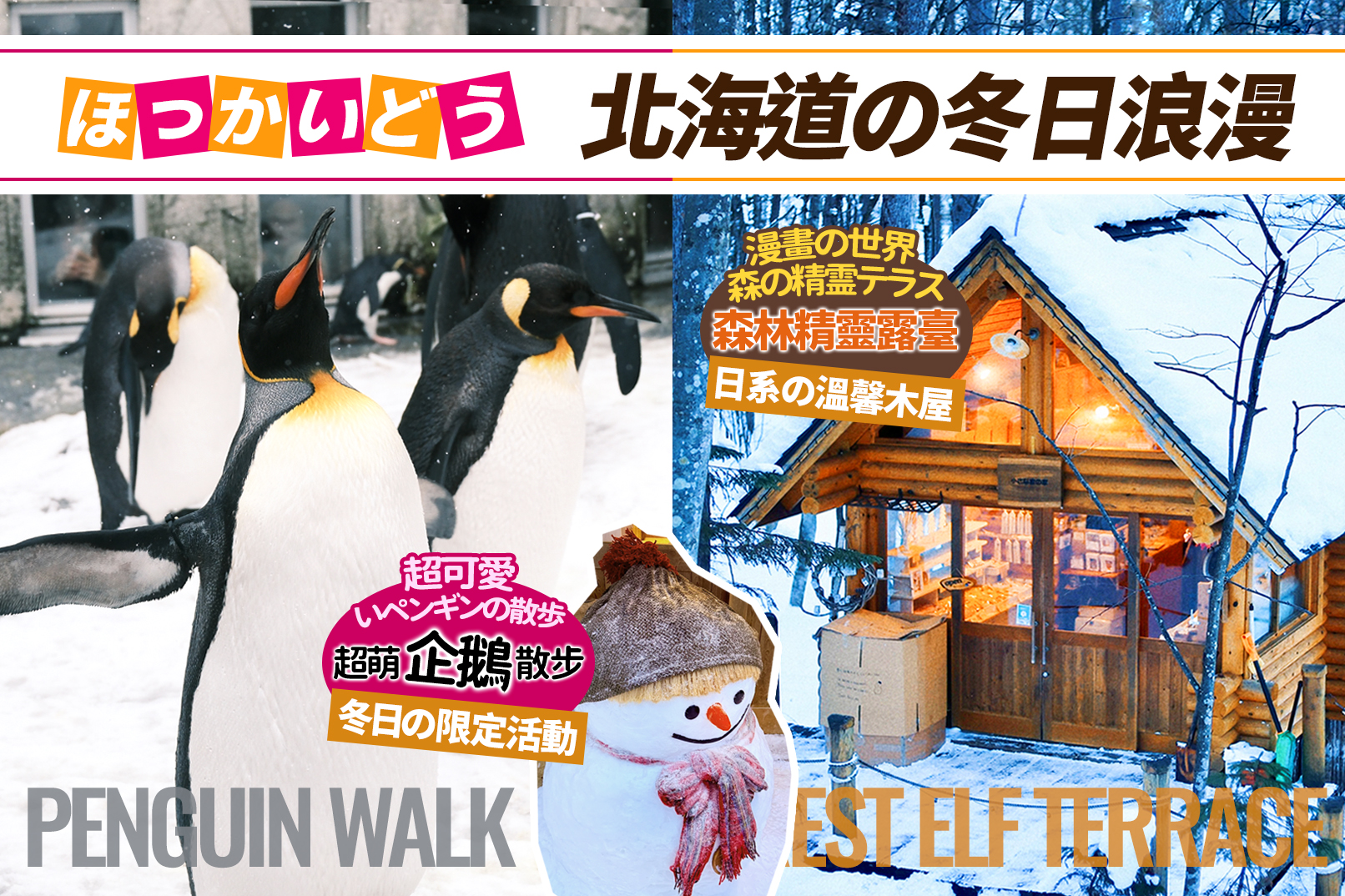 **北海道の冬は、世界へのラブレターであり、純白と青が出会う場所です。** **ルート概要**: ①旭山動物園-②网红Ken&Maryの木(車窓観光)-③白ひげの滝-④白金青い池(美瑛青い池)-⑤森の妖精テラス **ハイライト**: ①【旭山動物園】:旭川地区には日本最北の動物園があり、地元の特色の一つです。旭山動物園は寒帯動物をメインにしています。園側は天然の生息地に最も近い環境を作り上げ、園内の124種、700匹以上の動物に快適な環境を提供しています。冬には超かわいいペンギンの散歩を見ることができます。 ②【Ken&Mary】: 「ケンとメリーの木(Ken and Mary's Tree)」は、広告に登場した素朴な風景で知られています。1972年、日産スカイラインの広告「地図のない旅」で、撮影地である美瑛の丘陵地帯で、巨大なポプラの木を背景に使用しました。この木は、広告放送後、有名な観光スポットとなり、俳優の役名にちなんで「ケンとメリーの木」と名付けられました。 ③【白ひげの滝】:息をのむような冬の滝をご覧ください。霧氷と輝くつららが下のブルーアイスバレーを照らすときは、特に壮観です。 ④【白金青い池】:その最大の特徴は、ティファニーブルーのような色合いの池であり、池の中の白い枯れ木と相まって、多くのネットユーザーから「神様がうっかりひっくり返した絵の具パレット」と評されています。 ⑤【森の妖精テラス】:ここはまるで童話の中のシーンのようで、森に囲まれた木の小道に沿って、十数軒の温かみのある木造小屋が点在しています。