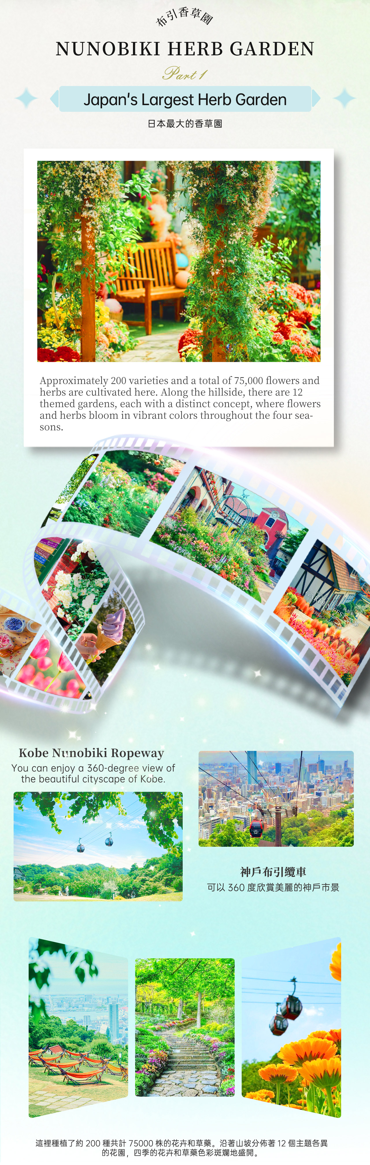 神戸は、一目で恋に落ちるような街です。 今回の旅程では、山海の風景、花々の香り、アートな美しさ、そして日本三大夜景をすべて同じ日に巡ることができ、程よいペースで、どこを切り取っても絵になります。 * 午前中は、市内から「神戸布引ハーブロープウェイ」に乗ってゆっくりと上昇し、全面ガラス張りの車窓からは、神戸の街並み、港、そして遠くの海岸線が徐々に広がります。到着すると、目の前に広がるのは日本最大規模の「布引ハーブ園」です。園内には、山の斜面に沿って12のテーマガーデンが点在し、約200種類、75,000株の花やハーブが植えられています。春の桜、初夏のバラとラベンダー、梅雨時のアジサイ、秋のコスモスと、一年を通して色彩に包まれています。疲れたら、ハンモックに寝転んで空を見上げたり、季節のハーブを加えた足湯を体験したりして、リラックスしながら神戸の美しい景色を眺めることができ、呼吸さえも軽やかになります。 * **午後の行程は、お好みに合わせて自由に選択できます**: * アートと没入体験がお好みなら、「átoa(アトア)神戸」がおすすめです。ここでは、水族、生物、デジタルアート、舞台照明が融合した劇場型空間が広がります。洞窟、森林から日本庭園、そして音楽と光に包まれた巨大な球体水槽まで、一歩足を踏み入れるごとに夢の中にいるような感覚になります。 * より港町の雰囲気を味わいたいなら、「メリケンパークと神戸ハーバーランド」を散策し、「BE KOBE」のモニュメント前で記念撮影をしたり、海岸線を散歩したり、神戸ポートタワーやモザイク大観覧車を眺めたりして、神戸ならではの異国情緒を感じることができます。 * 日が暮れると、旅程はハイライトを迎えます。「摩耶山」または「六甲山」に登り、展望台から「1000万ドルの夜景」と称される神戸の夜景を一望します。港から街、そして山々へと広がる灯りは、静かで輝かしく、この一日を最もロマンチックに締めくくります。