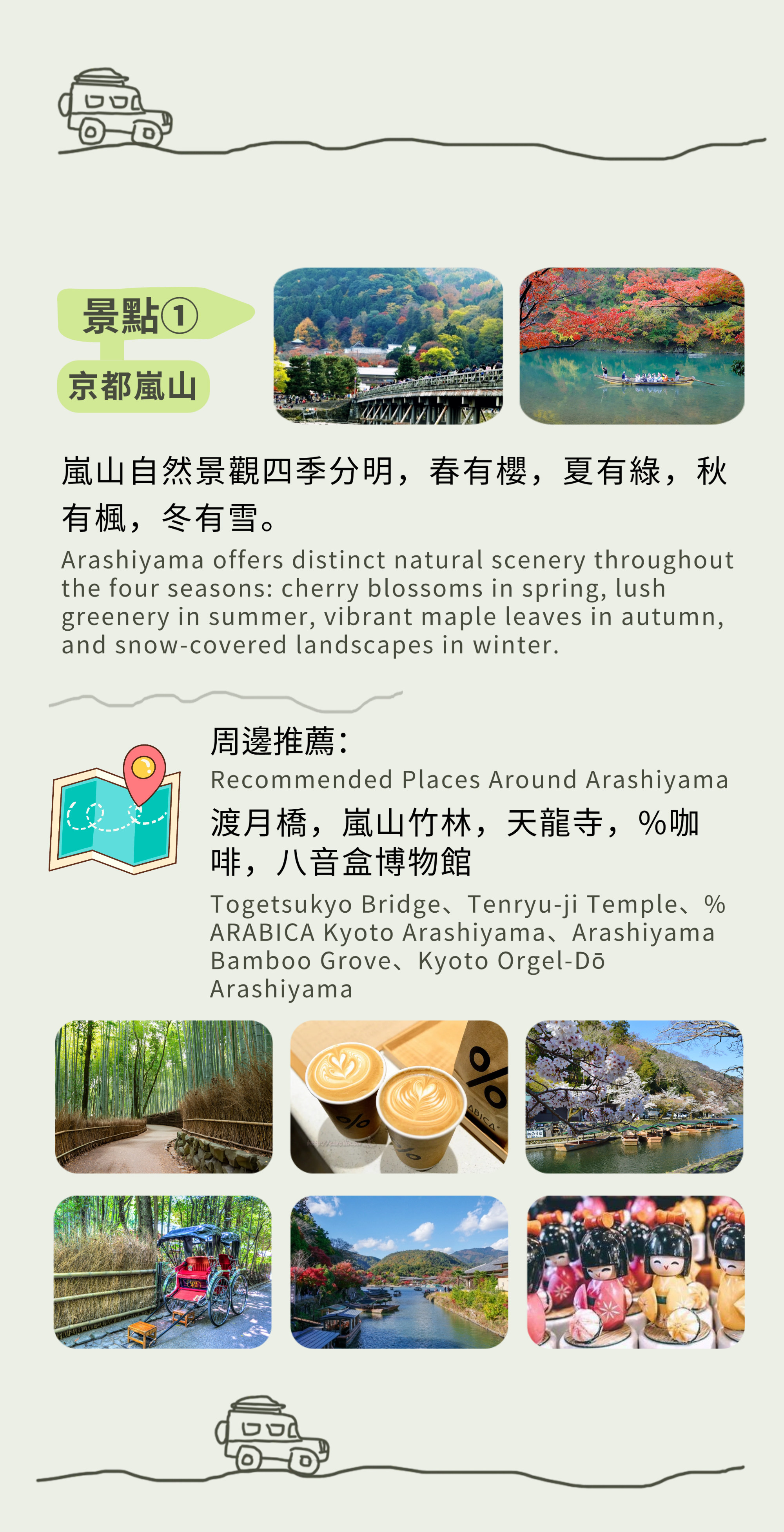 # ツアー紹介: ✨ 京都・奈良人気スポット一日観光詳細 大阪または京都を出発し、嵐山、奈良公園、伏見稲荷大社を深く探求し、一日で自然の美しさと歴史文化を満喫します。 最初の目的地:嵐山 Arashiyama 旅は、朝の空気が澄み、人出が少ない嵐山から始まります。 定番の渡月橋に立ち、四季折々の壮大な景色をお楽しみください。 2番目の目的地:奈良公園 Nara Park 奈良に来たら、鹿との触れ合いは欠かせません。 奈良公園は春日大社に隣接する広大な緑地で、ここの鹿は神の使いとされており、1300年以上の歴史があり、現在は国の天然記念物に指定されています。 3番目の目的地:伏見稲荷大社 Fushimi Inari Taisha ここは日本全国に約3万社ある稲荷神社の総本宮で、西暦711年に創建され、長い歴史を持っています。 赤い鳥居との写真撮影をお勧めします。旅の最も代表的なシーンを作り出しましょう 参道を散策し、日本のスナックや地元の軽食を味わいます 稲荷山全体が神聖な領域であり、その中を歩くとまるで別の世界に入り込んだかのようです。ここは日本の旅行で見逃せない絶景スポットです!