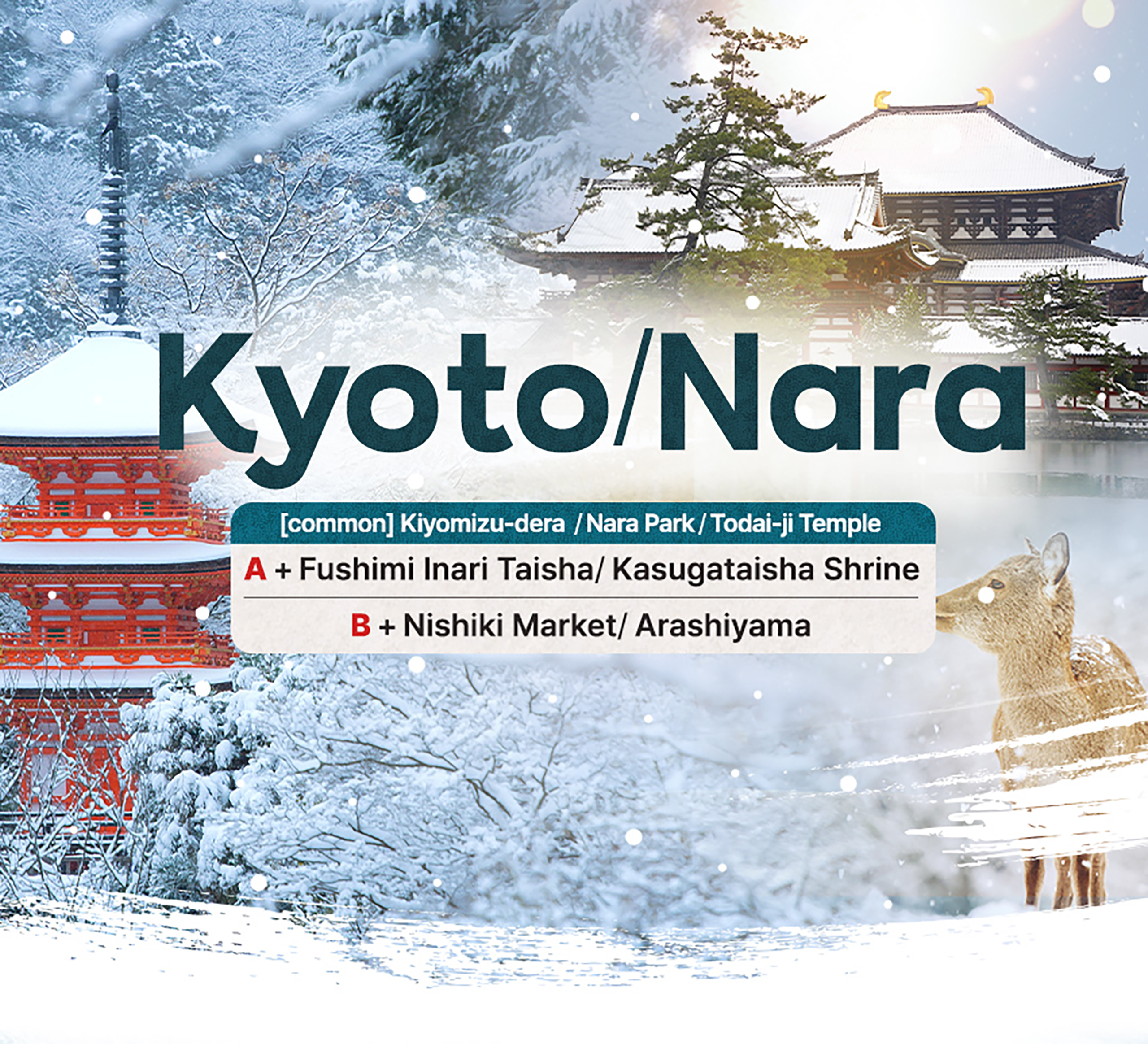 ## 大阪発、京都と奈良をバランスよく巡る日帰り旅行 **【Aコース】** 清水寺から市街の景色を眺め、伏見稲荷大社のどこまでも続く鳥居を歩きましょう。 宇治で抹茶スイーツと優雅さを堪能してから、奈良へ向かいます。 人懐っこい鹿に出会い、大仏を見学し、春日大社の灯籠が灯る道で一日を締めくくりましょう。 日本の美しさ、文化、そして穏やかさを満喫できる、慌ただしさのない充実した旅です。 **【Bコース】** 神聖な歴史、自然、そして日本の豊かな味覚が完璧に調和した旅。 嵐山 (Arashiyama) の鮮やかな緑の道を散策し、息をのむような美しい風景を写真に収めましょう。 錦市場 (Nishiki Market) の活気ある雰囲気の中で、地元の味や地域の珍味を堪能しましょう。
