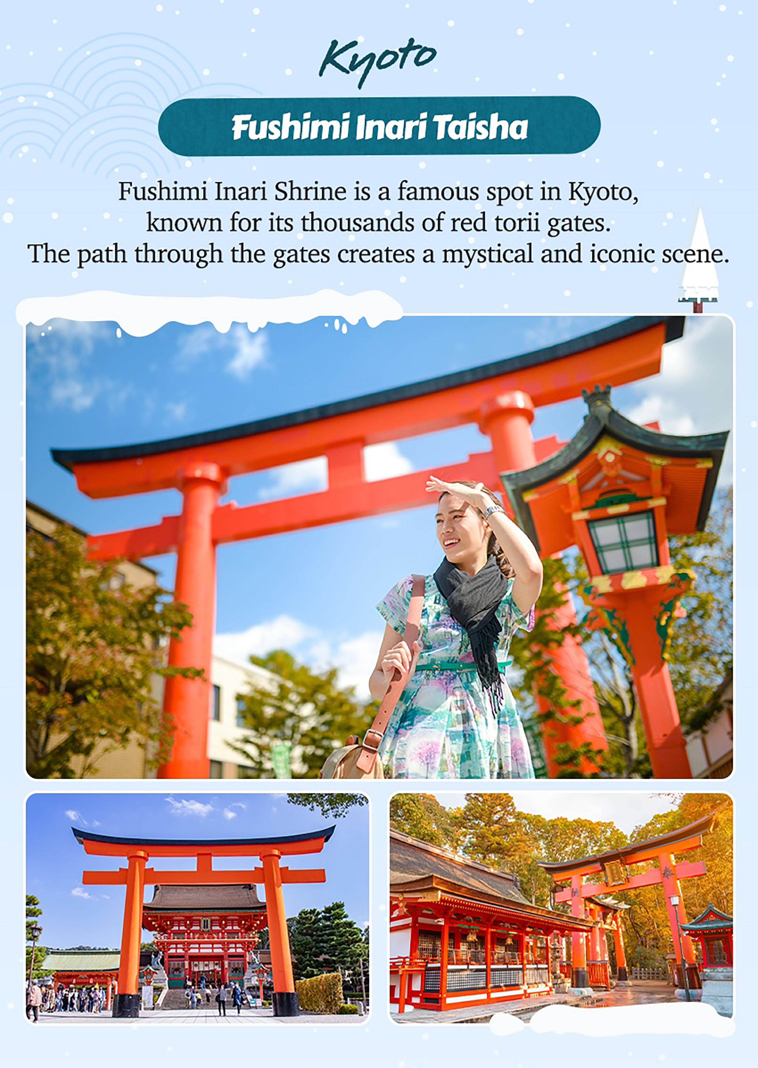 - * **伏見稲荷大社**の象徴的な赤い鳥居をくぐりましょう。