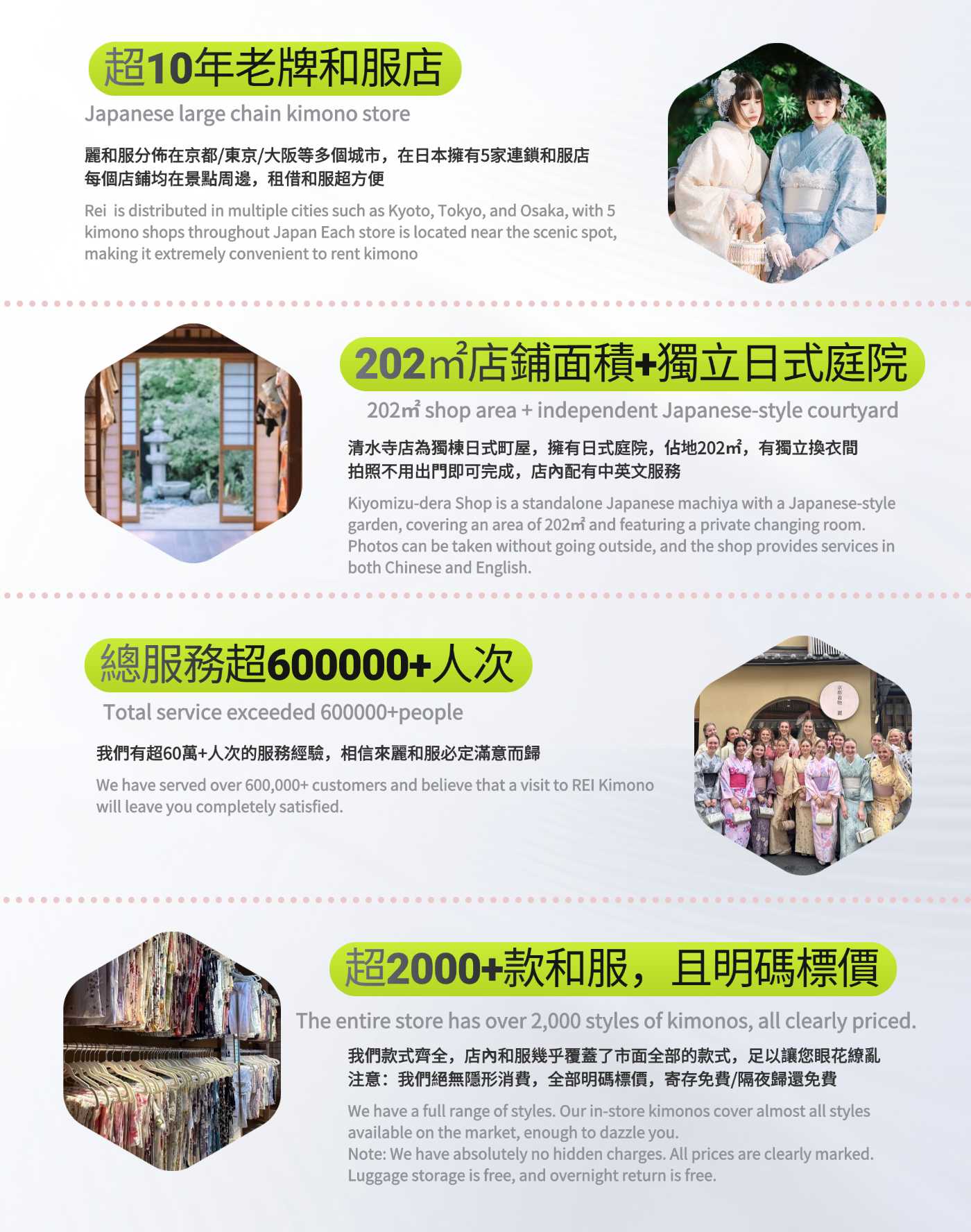 麗着物ブランドは設立から10年以上が経過し、日本国内に5店舗を展開する大規模な有名ブランドです。主要なソーシャルメディアプラットフォームのインフルエンサーにも選ばれる店舗の一つで、毎年5万人以上の観光客を迎え、数万件の好評をいただいております。日本で着物体験をするなら、麗着物が最高の選択です。 私たちはサービスに自信を持っており、以下のことをお約束します。 1. 予約後に急遽来店できなくなった場合でも、無料で日程変更が可能です。来店後、着付け前にご満足いただけない場合は、変更または返金申請が可能です。 2. 無料で翌日返却、無料の化粧品使用、無料の荷物預かり、着物保険料無料、一部小道具の無料使用が可能です。 3. 厳選された日本人カメラマンが、様々なシーンでの撮影を保証します。カメラマンが最初の1枚を撮影した時点から時間を計測し、1~48時間以内にデータをお渡しします。 4. 中国語、英語、日本語など多言語でのサービスを提供します。プロの着付け師とスタイリストがマンツーマンで対応し、ご満足いただけるまで丁寧に調整します。 5. 2000着以上の着物を取り揃えており、斬新なデザインで他の方と被ることはありません。 京都着物レンタル麗 清水寺店 Googleマップ:京都着物レンタル麗 清水店 営業時間:09:00-18:00(着物返却は17:30まで、閉店は18:00) 住所:京都市東山区五条橋東大谷前東入白糸町572番地11 *営業終了時間までに着物をご返却ください。混雑を避けるため、早めの準備をお勧めします。