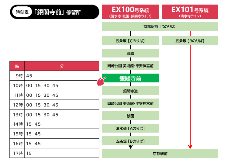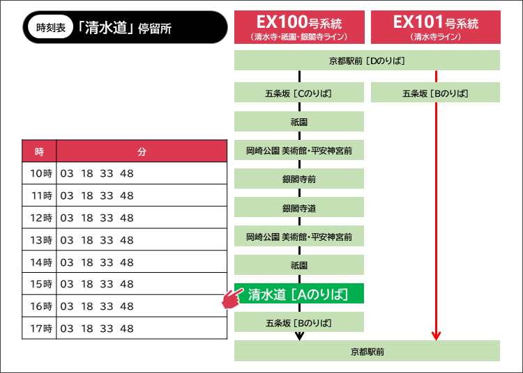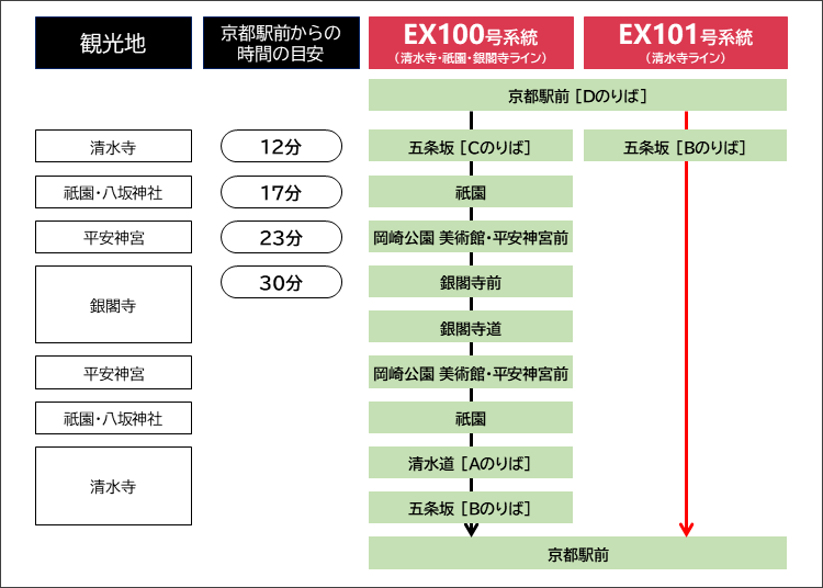 午前中は7~8分間隔で運行しているので、バス停で待っていても次々と来る印象を持つでしょう。2025年3月22日現在の時刻表は以下のとおりです。(最新の時刻表はこちらから。)清水寺へはEX100・EX101いずれに乗ってもアクセスできます。