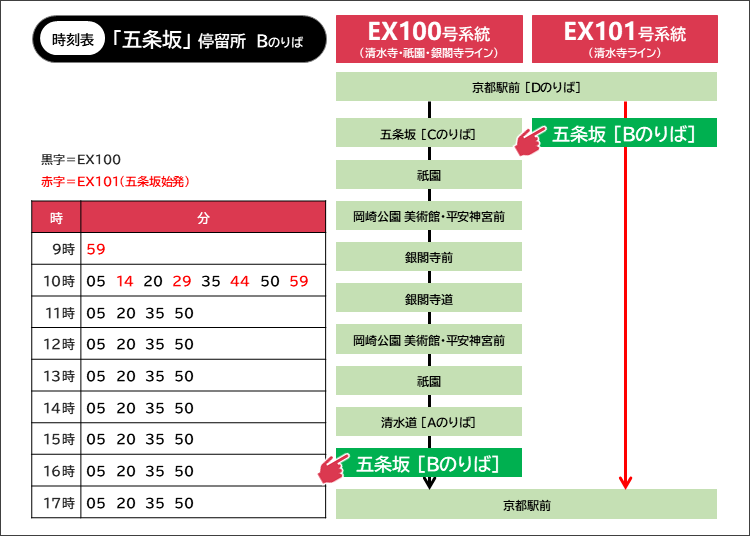 観光客に人気の清水寺へは、「五条坂」停留所で降りてください。EX100とEX101は運行ルートが異なるため、停車するバス停の位置も異なります。参考として清水寺周辺のバス停について図のようにまとめましたが、降車後に迷った場合は地図アプリ等を確認することをおすすめします。