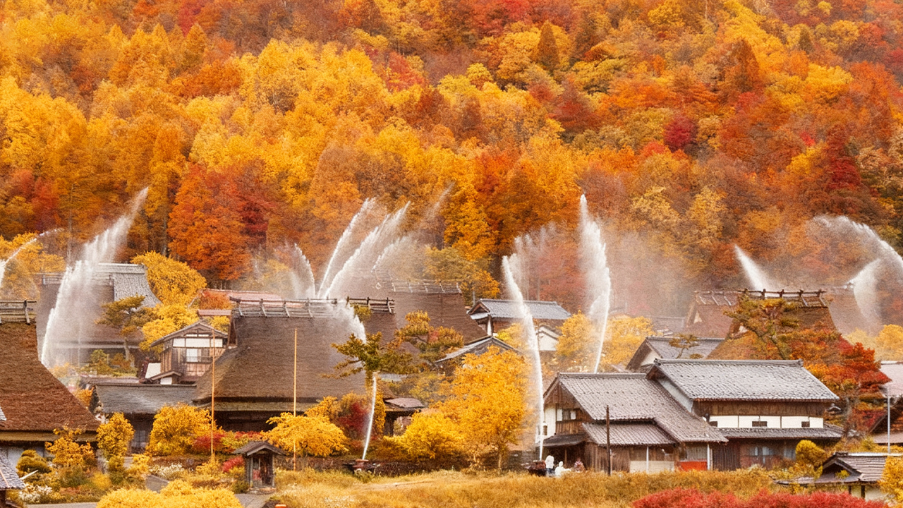 - - The spectacular simultaneous water release inspection at Miyama Kayabuki no Sato, held only twice a year, is a wonder of flying water sprays and the ancient village's "water protection ceremony"