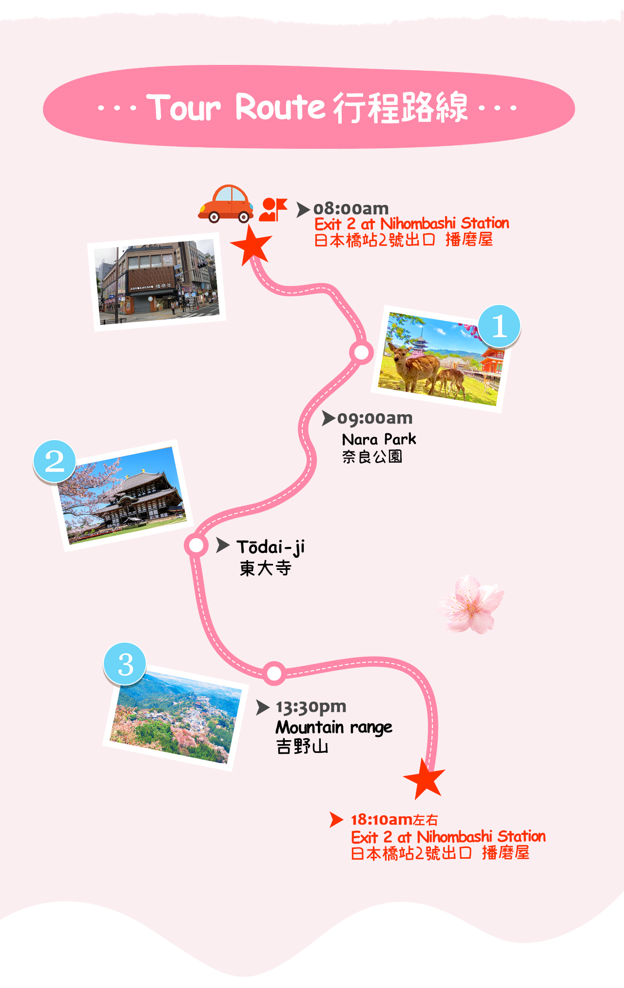 奈良の春日限定の桜、古跡、そして鹿の世界へ 奈良公園は奈良市若草山の麓に位置し、奈良を代表する都市公園であり、春には桜の名所として人気があります。園内および周辺の若草山は「日本の桜名所100選」に選ばれており、春には奈良八重桜、ソメイヨシノ、ヤマザクラ、シダレザクラなど約1,700本の桜が咲き誇ります。桜と鹿が一緒に写る風景は、奈良の春を象徴する最も有名な風景です(園内の浮見堂も人気の桜の撮影スポットです)。 春日大社は奈良公園内にあり、768年に創建されました。日本全国にある3,000以上の春日神社の総本社であり、世界文化遺産にも登録されています。参道の両側には石灯籠と朱色の回廊が並び、荘厳で静謐な雰囲気を醸し出しています。 春日大社から奈良公園まで徒歩で戻り、自由時間となります。園内には最も多くの鹿が集まっており、観光客は鹿せんべいをあげて触れ合うことができ、奈良観光で最も人気のある体験の一つです。 その後、日本の桜の名所である吉野山へ向かいます。吉野山には約3万本のヤマザクラがあり、桜は山の斜面に沿って下から上へと順に咲き、全国的に有名な「一目千本」の景観を作り出します。ここは春に関西地方で最も代表的な桜の名所の一つです。 奈良公園から吉野山まで、一日かけて日本で最も美しい春の風景を堪能してください。