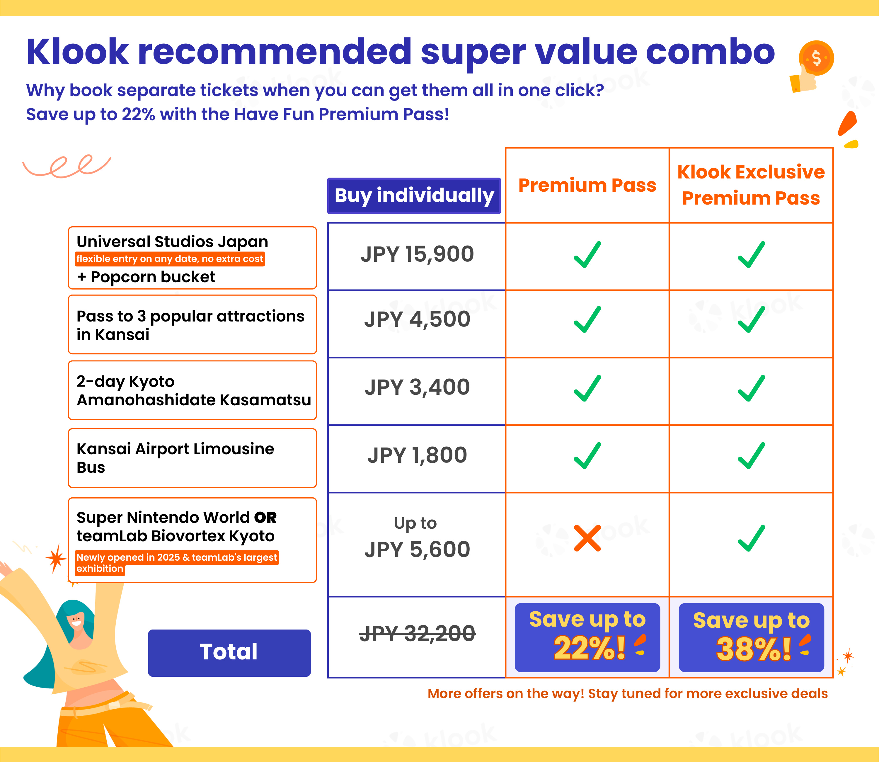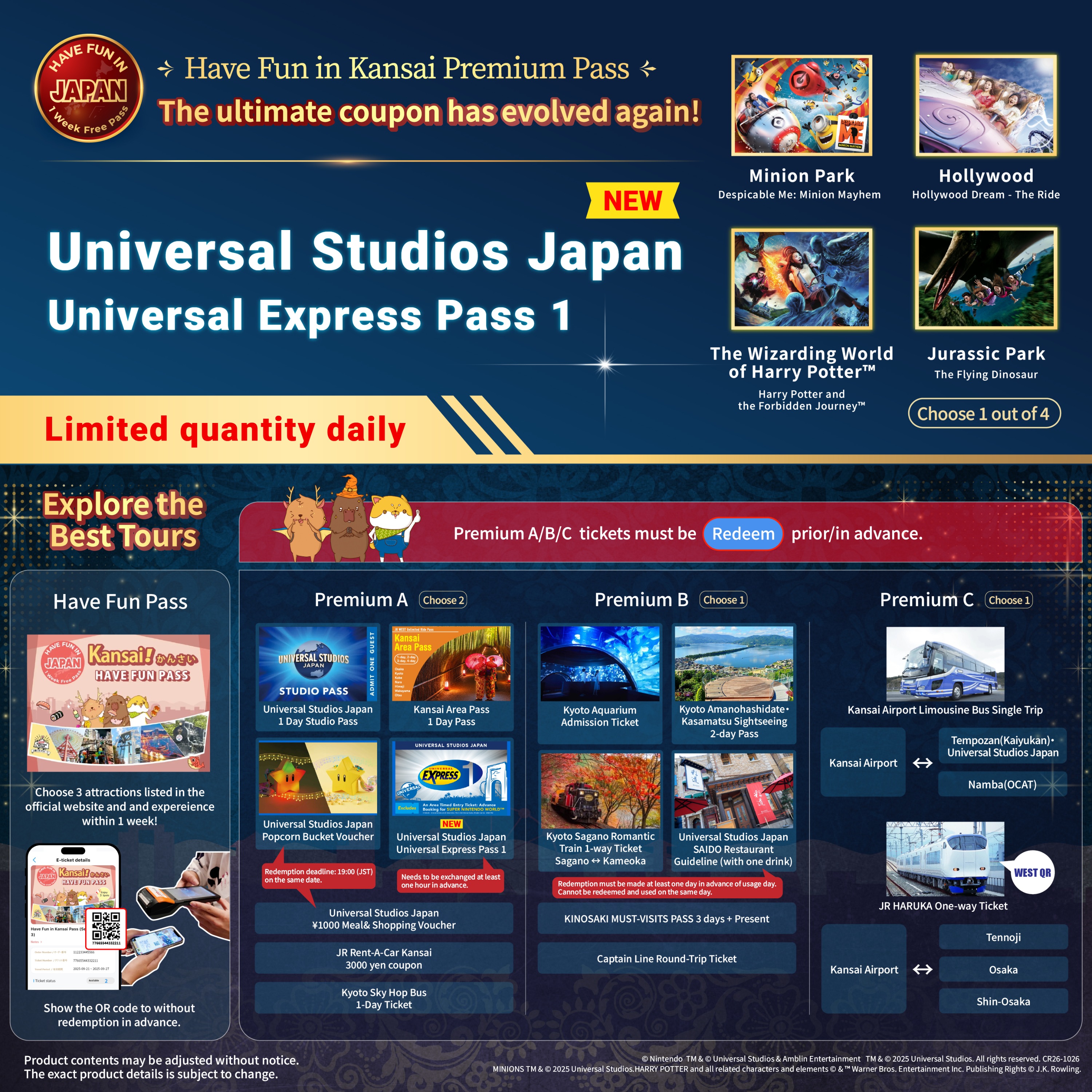 - * **Multiple premium options:** Universal Studios Japan, 1-day JR Kansai Area Pass, Kyoto Hop-On Hop-Off Sightseeing Bus Ticket and more!