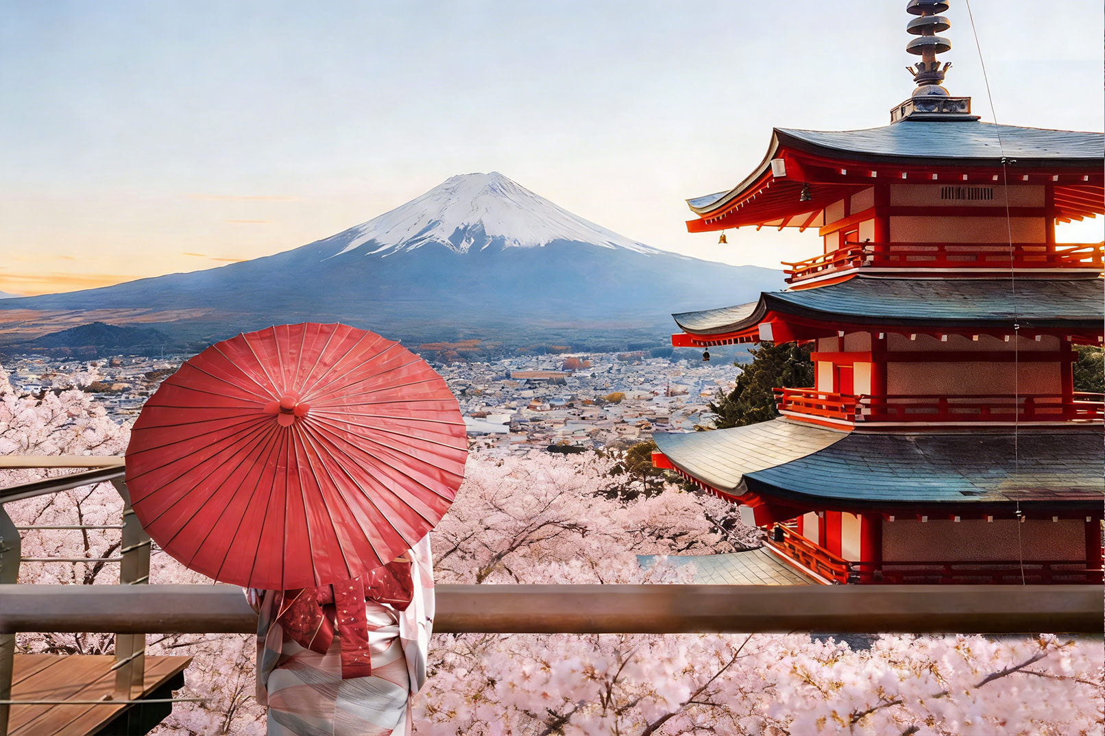 【富士山の壮大な美景探秘日帰りツアー】新倉山公園&河口湖大石公園&忍野八海&INS人気ローソン&日川時計店(東京発)