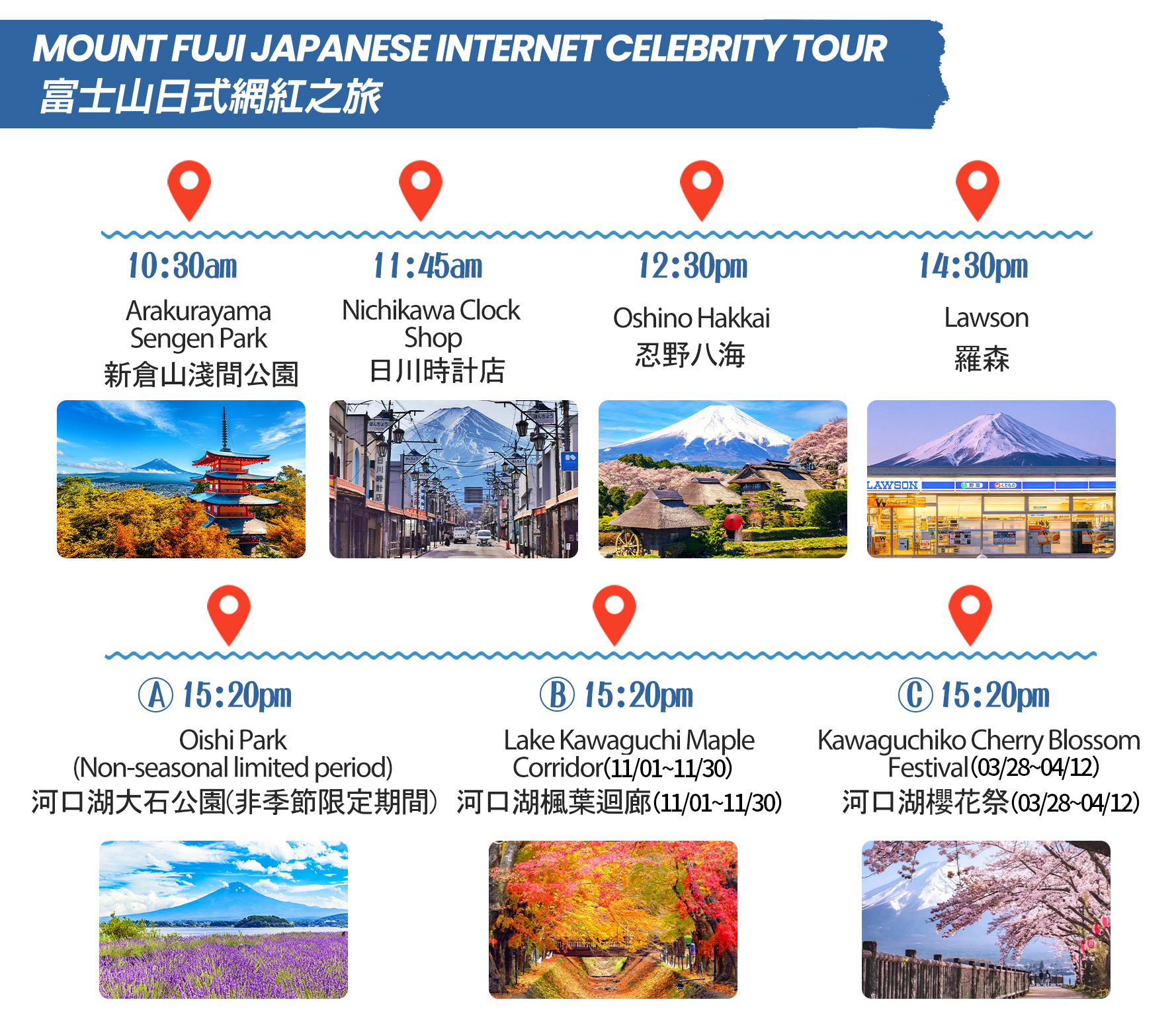 ## おすすめの厳選コース(3つの中から1つ選択) ## 【富士山パノラマ遊覧コース】 五合目、新倉山浅間公園、忍野八海などの定番スポットを網羅し、アウトレットでの買い物や温泉でのリラックス体験も含まれており、富士山周辺のハイライトを一箇所で満喫できる、旅行に欠かせない選択肢です。 ## 【河口湖抹茶&ロープウェイ1日ツアー】 河口湖旅行のために特別に設計:ローソンから出発し、本場の抹茶を味わい、ロープウェイ