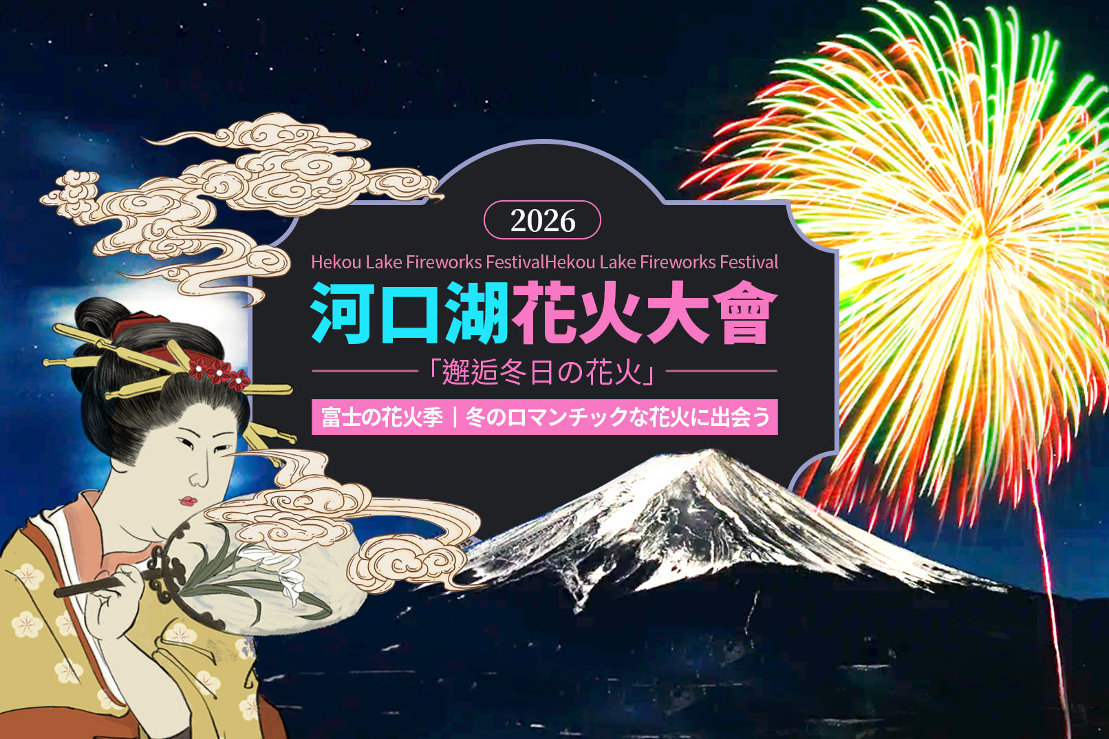 # **冬の夜のロマンスに出会い、花火が咲くときめきが響き合う!** 河口湖花火大会は、日本の山梨県富士河口湖町で毎年夏に開催される最も代表的な**花火大会**の一つです。世界文化遺産の富士山を背景に、河口湖畔で花火が打ち上げられ、花火が湖面に映り込み、「**富士山と花火の共演**」という絶景が生まれます。 **旅程概要**: ①新倉山浅間公園-②日川時計店-③忍野八海-④大池公園 **観光スポット紹介**: **新倉山浅間公園**:富士山を眺める絶好のスポットの一つです。 **日川時計店**:吉田市にある老舗の時計店で、店の前の通りと富士山が織りなす独特の街並みが、世界的に有名な写真撮影スポットとなっています。 **忍野八海**:「日本の九寨溝」と称され、8つの天然の泉があることで知られています。 **大池公園**:**花火大会の主要会場**であり、観光客に最も人気のある観覧スポットの一つでもあります。雪をかぶった富士山を背景に、冬の晴れた夜空を彩る花火をお楽しみください。