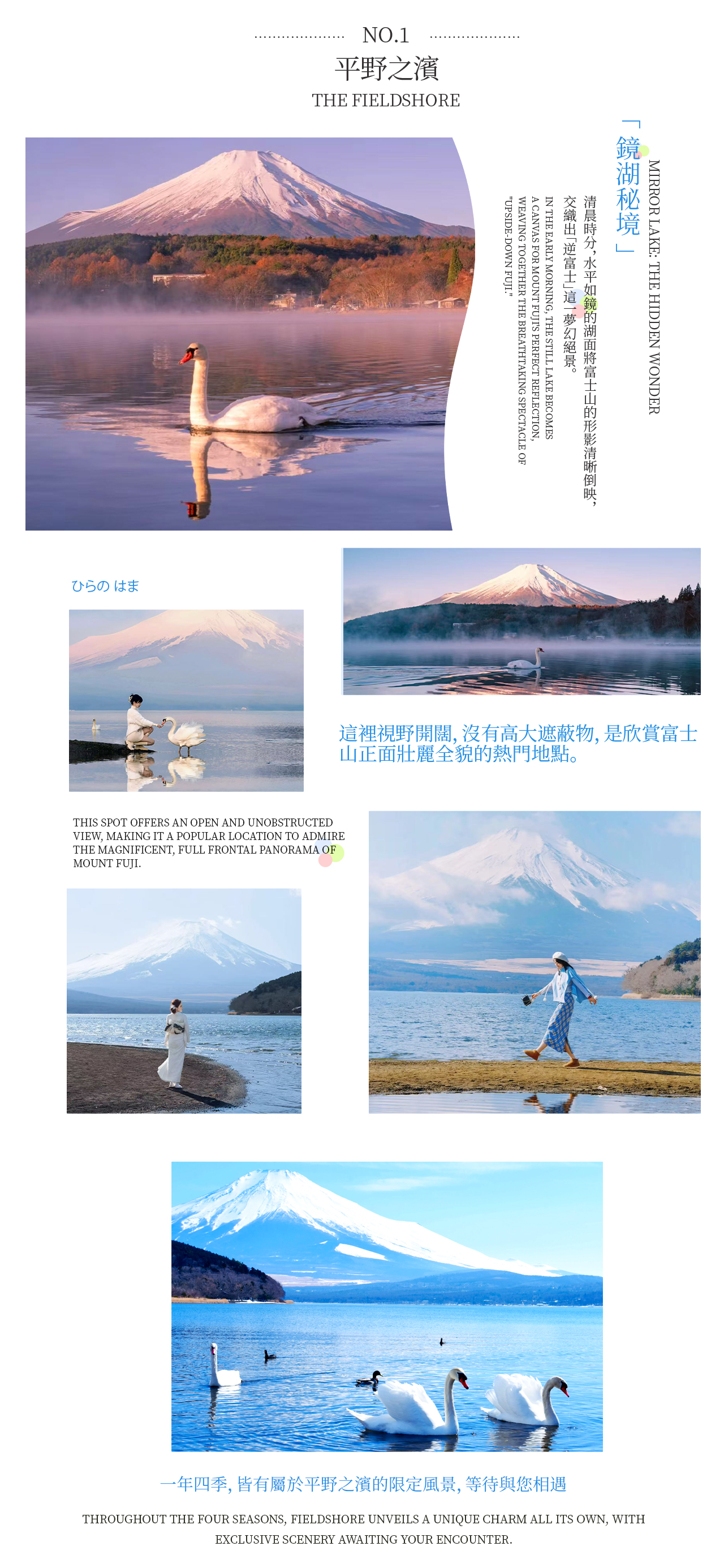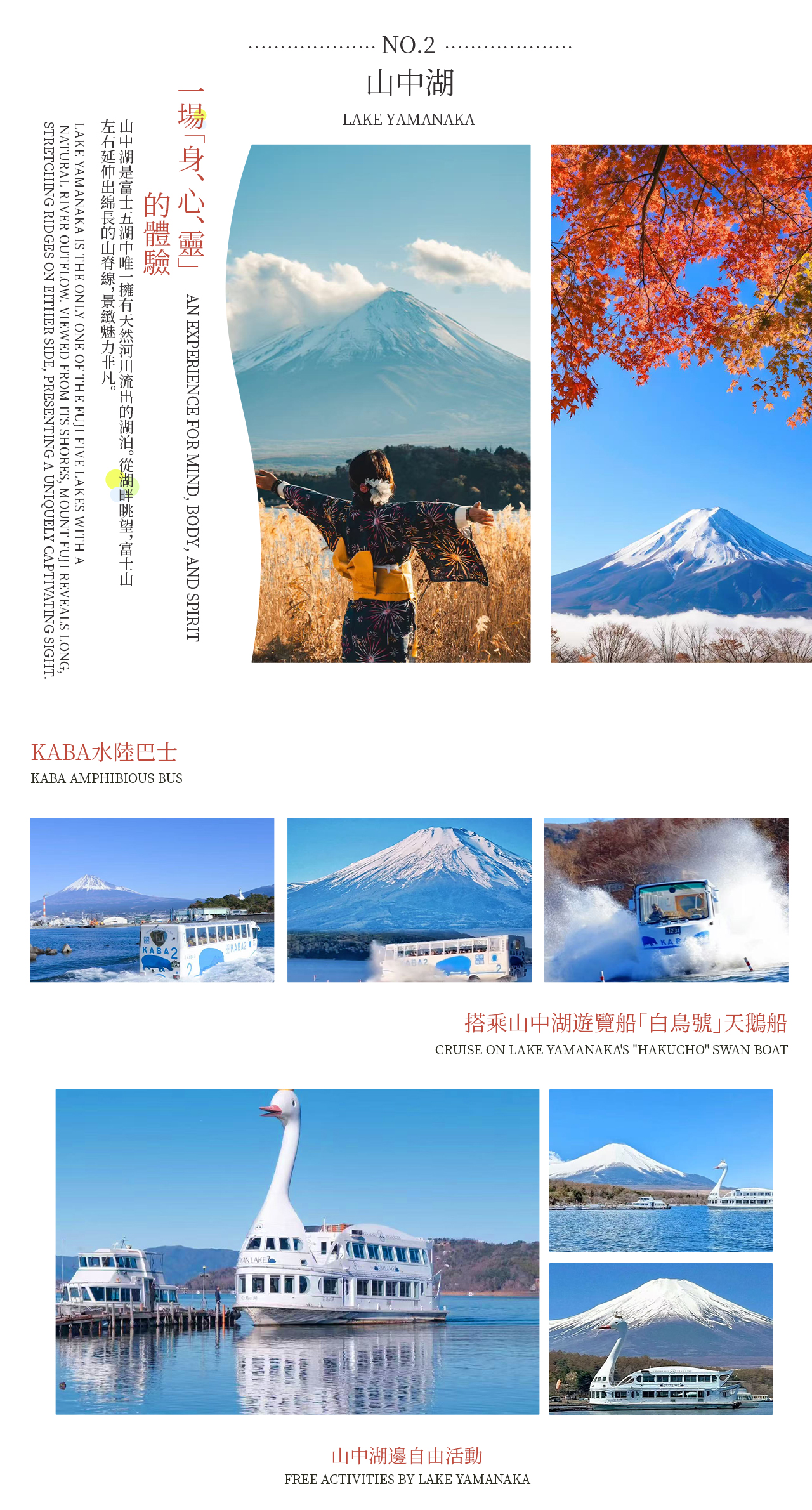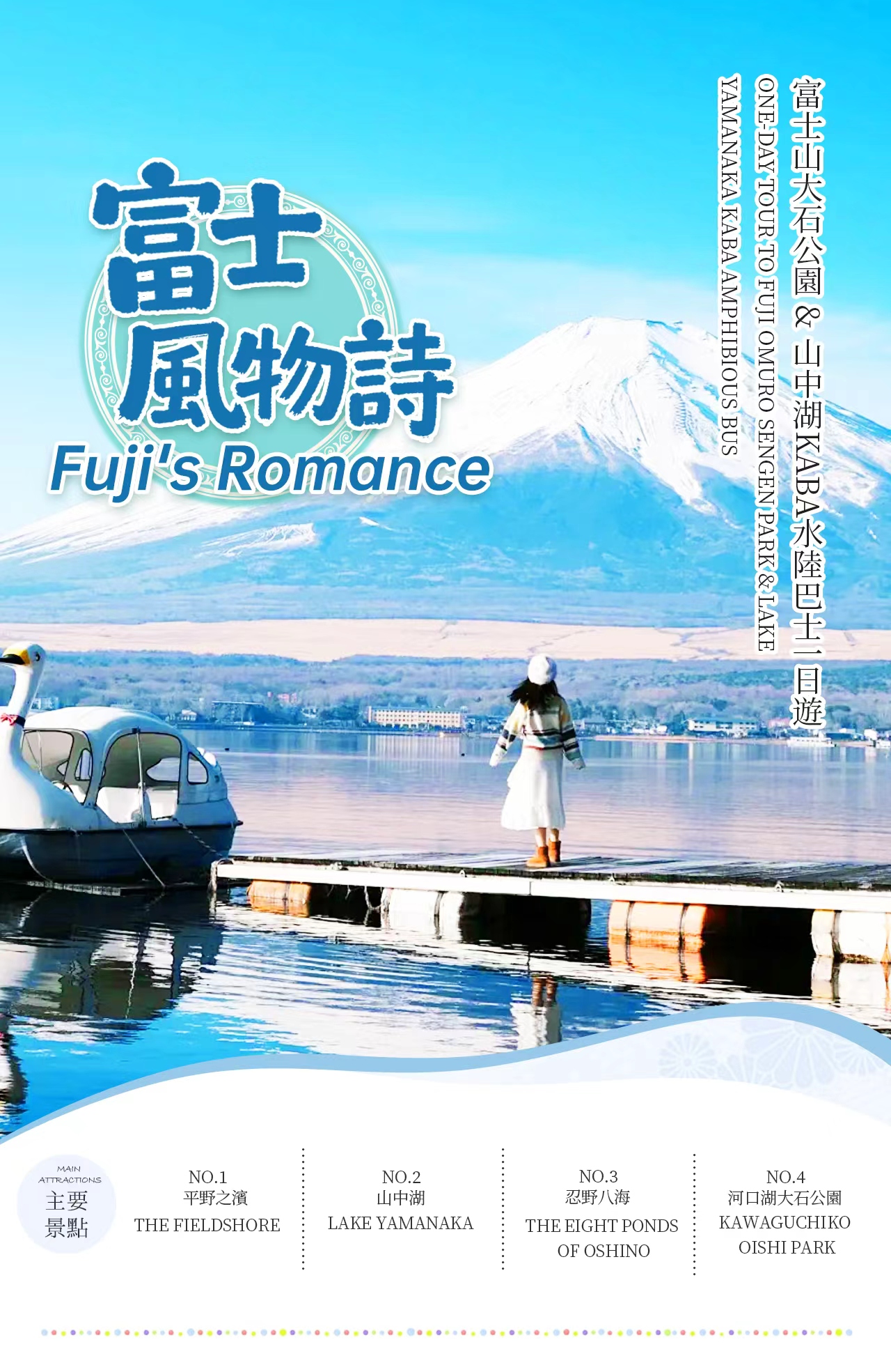 富士山日帰り奇跡の旅に出かけましょう!東京から出発し、まずは【平野之浜】で午前中の「逆さ富士」の鏡湖の秘境を見に行きます。次に【山中湖】でKABA水陸両用バスに乗って遊覧船に変身し、湖と山を眺めたり、白鳥号スワンボートに乗って白鳥に餌をあげたり、サイクリングや湖畔でゆっくり過ごしたりすることもできます。さらに【忍野八海】に行って富士山の雪解け霊水を飲み、最後に【河口湖大石公園】で花畑、鳥居、富士山が同じフレームに収まる絶景を写真に収め、新鮮なミルクアイスクリームを味わうこともできます。一日で富士山の美しい景色、珍しい体験、特色あるグルメをすべて手に入れましょう! ## * 暖かいヒント 当日の水位上昇や天候などの不可抗力により、KABA水陸両用バスにご乗車いただけない場合は、ガイドがその場で旅程を調整し、白鳥号遊覧船にご乗船いただきます。この場合に生じた差額は払い戻しできませんので、ご了承ください。
