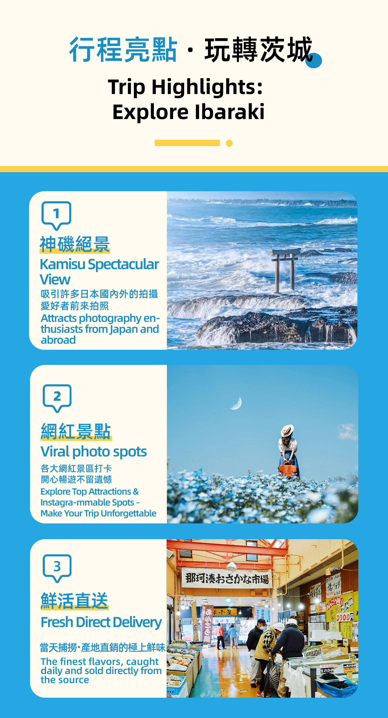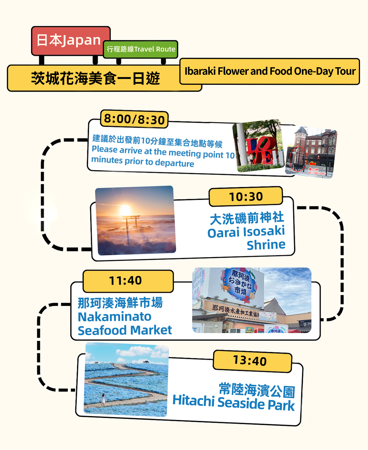 - * 那珂湊海鮮市場を訪れて、新鮮な旬の魚介類を味わい、本物の漁港スタイルを体験してください。