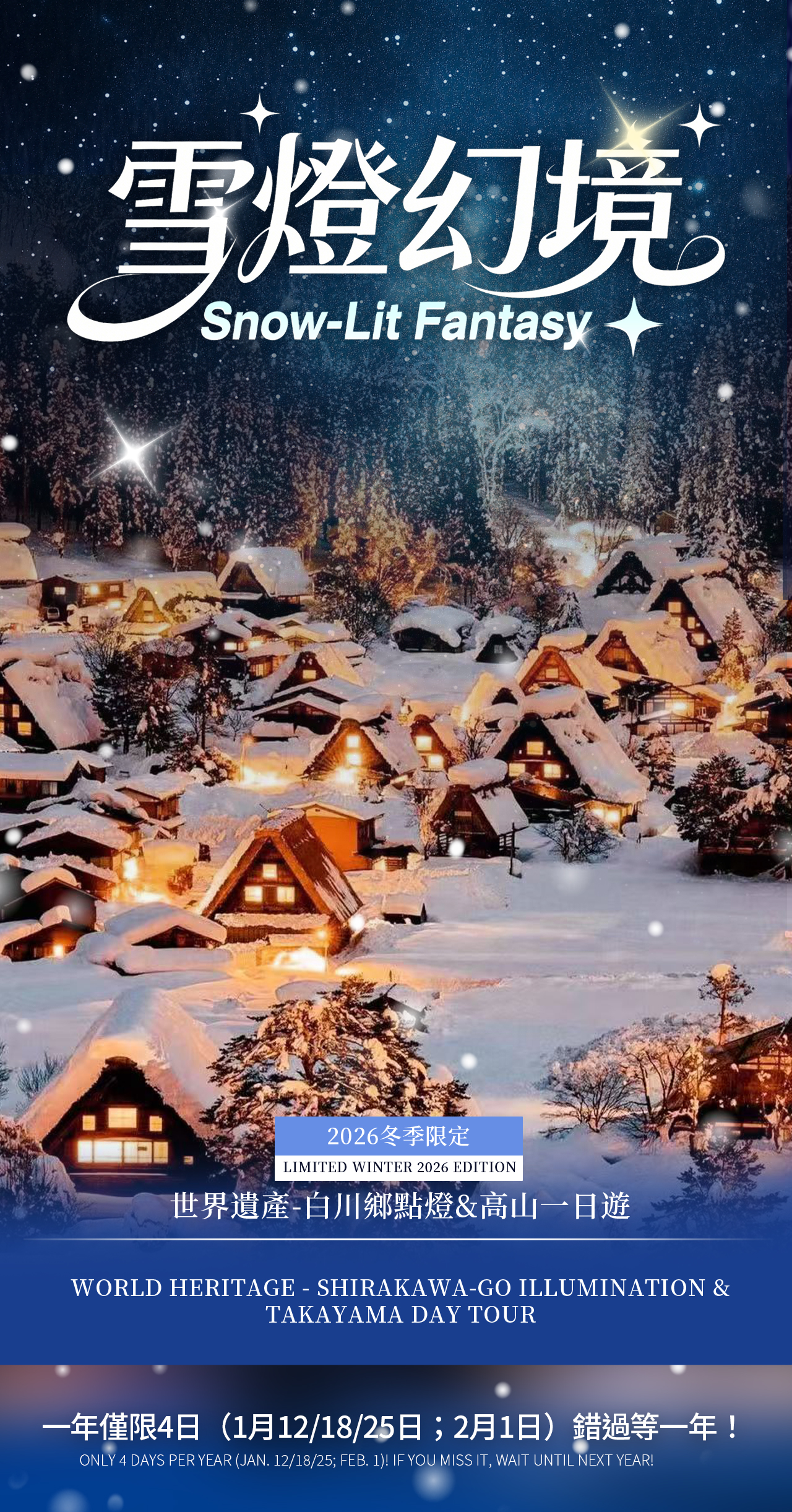 厳冬の中、世界遺産である白川郷の合掌造りの家は雪をまとい、ライトアップされるとまるで童話の世界のようです。この日帰りツアーは名古屋から出発し、この期間限定の美しい景色を見ることができ、飛騨高山の古い街並みを散策することもできます。1名様からご参加可能で、待つ必要はありません。プロが手配した旅程なので、心配する必要はなく、人混みを避けて、静かに冬の美しさを楽しむことができます。 # 冬季限定の夢幻の旅:白川郷ライトアップ 夜の帳が降り、白雪が合掌造りの茅葺き屋根を覆い、村落にはちらほらと明かりが灯り、真っ白な雪の上に映し出されると、白川郷全体が一瞬にしておとぎ話の中の町に変わります。和田家付近、明善寺付近、西側付近、官町付近、下谷付近などのエリアが温かい光に包まれ、まるで夢のような仙境のようです。 # 飛騨高山古い街並み散策:江戸時代のタイムトリップ 飛騨高山の古い街並みに足を踏み入れると、まるで時空を超え、鮮やかな江戸時代の絵巻に足を踏み入れたかのようです。飛騨高山は岐阜県北部の飛騨地方の中心部に位置し、「飛騨の小京都」とも呼ばれ、江戸時代からの城下町、商家町の形態をそのまま保存しています。 ※白川郷の冬は寒く積雪がありますので、暖かい服装と滑り止めのある靴を着用してください。夜間のライトアップは光が弱いので、懐中電灯をお持ちになることをお勧めします。冬は屋根に積雪や氷柱があり、落下する場合がありますので、安全にご注意ください。
