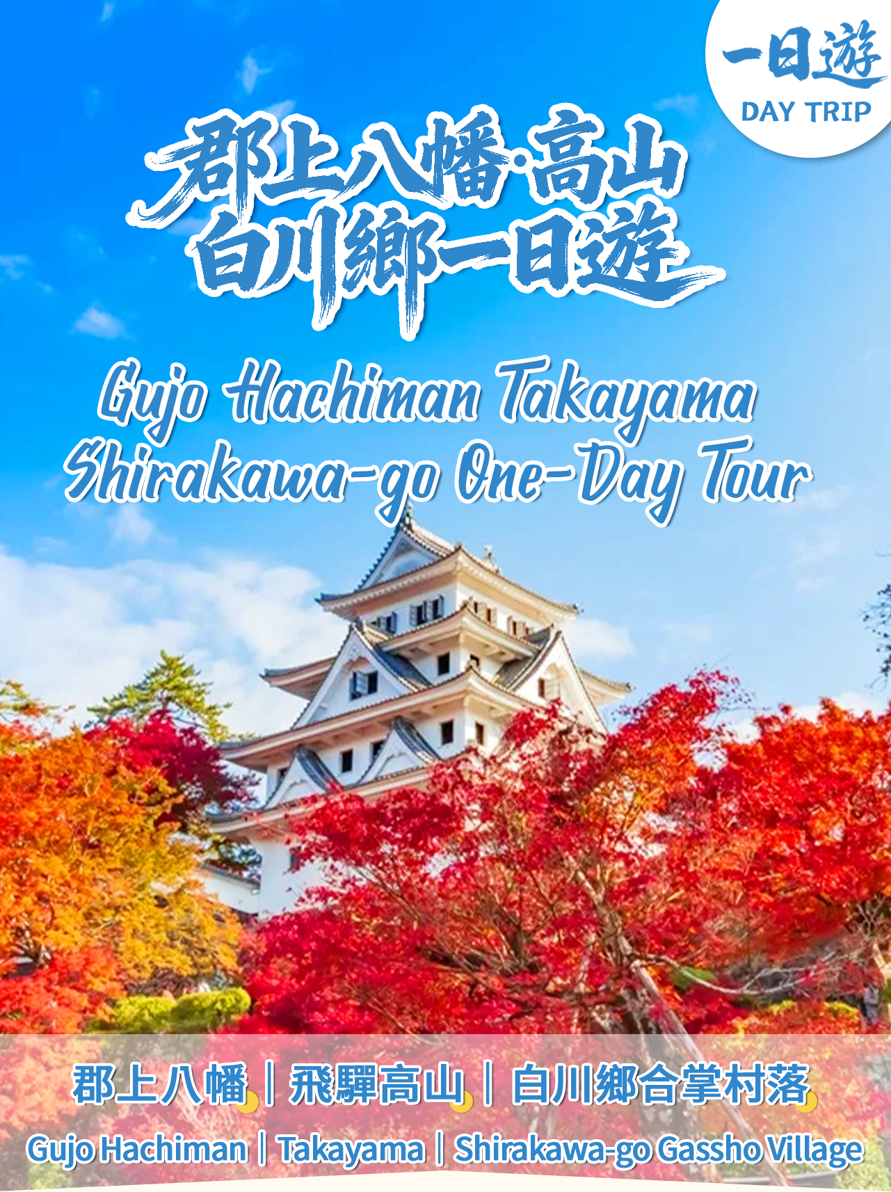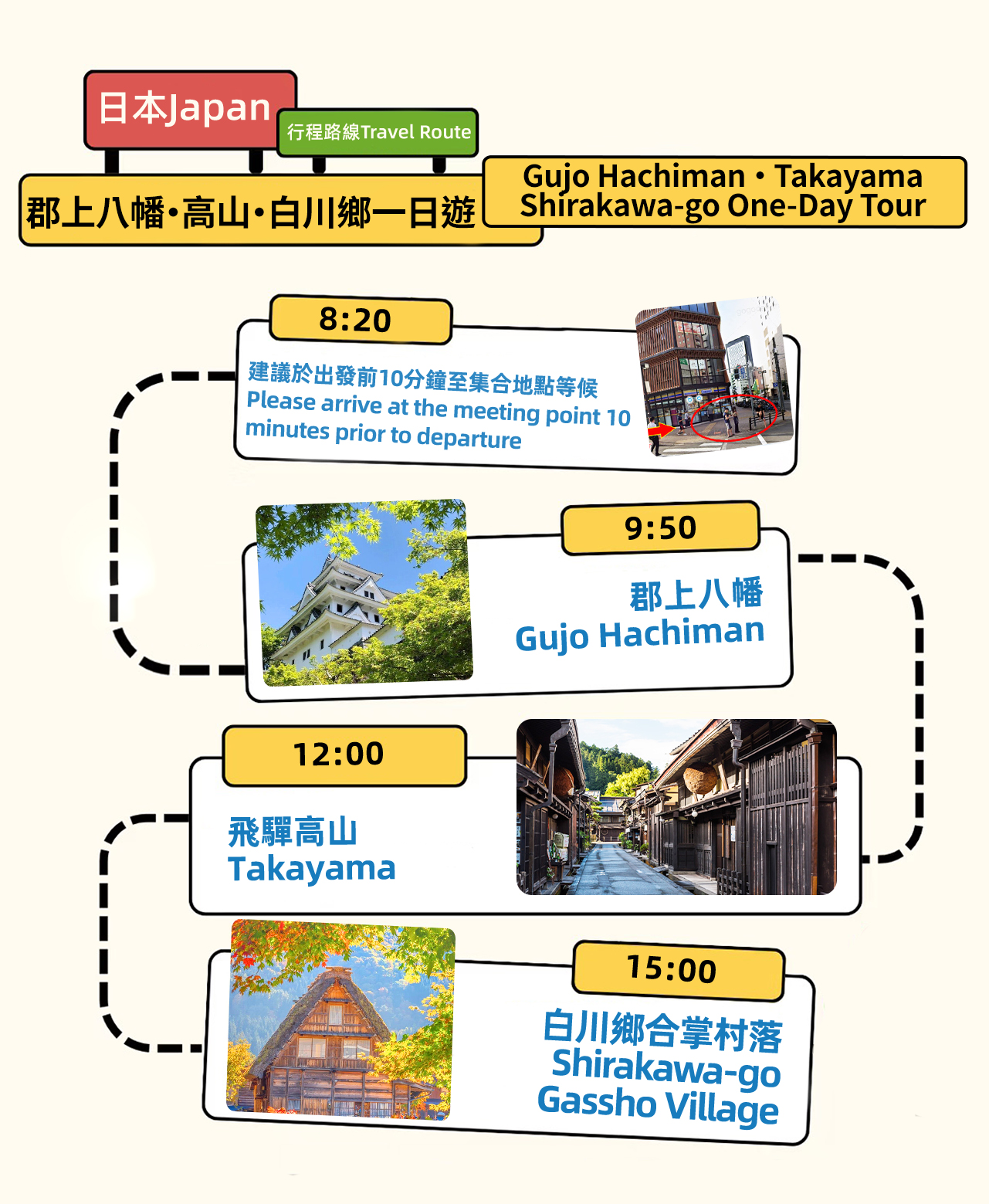 このコースは、名古屋から出発し、岐阜県の3つの主要観光スポットを巡る定番ルートです。1日で日本の自然、古都の魅力、世界遺産を堪能できます。 最初の目的地:郡上八幡:水の古都。吉田川沿いの宗祇水は清らかで、江戸時代の風情が残る街並みと八幡城の天守閣が調和しています。食品サンプル作りも楽しめます。 2番目の目的地:飛騨高山:飛騨の小京都。古い町並みである三町筋には趣のある木造建築が立ち並び、飛騨牛は必食です。さるぼぼや木彫りのお土産もおすすめです。 3番目の目的地:白川郷:世界遺産の合掌造り集落。茅葺屋根が合掌したように見える家々が並び、田園風景が広がります。雪国の知恵を訪ねてみましょう。