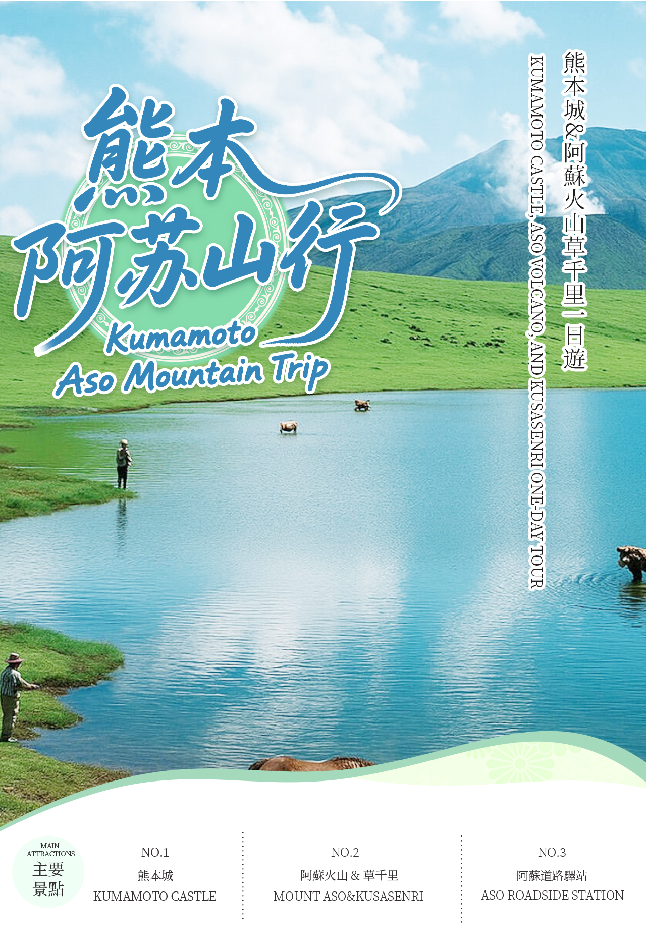 ## ⚠️重要なお知らせ:阿蘇山が噴火の危険性やその他の規制により立ち入り禁止となった場合、お客様の旅の体験を保証するため、ガイドは現地の状況に応じて旅程を柔軟に調整し、充実したスムーズな旅程を確保します。当日の通知にご注意ください。ご理解とご協力をお願いいたします! ## ⚠️重要なお知らせ:熊本A行程 | 熊本城からご乗車のお客様へ:今回の観光バスは朝に福岡を出発し、熊本を経由してお客様と合流します。突発的な交通渋滞やその他の不可抗力により、バスの到着が遅れる場合がございます。ご理解の上、しばらくお待ちください。 ## また、熊本城および周辺の観光スポットは自由見学区間となり、ガイドは同行いたしません。各自で観光をお楽しみいただき、バスが熊本城を出発する時間までに必ず集合場所にお戻りになり、グループと合流してください。ご理解とご協力をお願いいたします! 専用車で熊本城へ!再建された「武士の城」を訪れ、黒い城壁と天守閣の壮大な歴史に触れ、戦国武士になりきって写真撮影