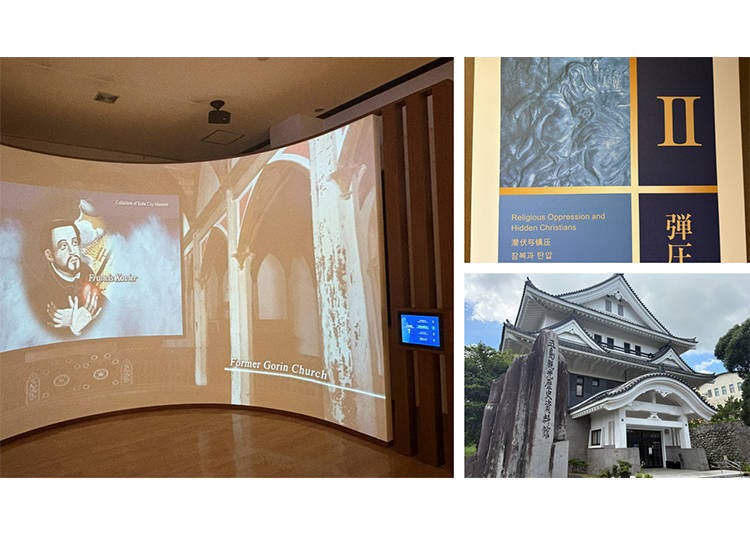 さらに五島市の歴史を知りたいなら、五島観光歴史資料館もおすすめです。特に3階の潜伏キリシタンの歴史を紹介する展示は、是非とも立ち寄ってもらいたい場所の一つです。体感シアターの曲面スクリーンに映し出される五島キリシタン史の解説と臨場感あふれる映像は英語対応もしており、徳川幕府の約250年にわたる弾圧の中で、信仰を守った潜伏キリシタンについて詳しく知ることができます。