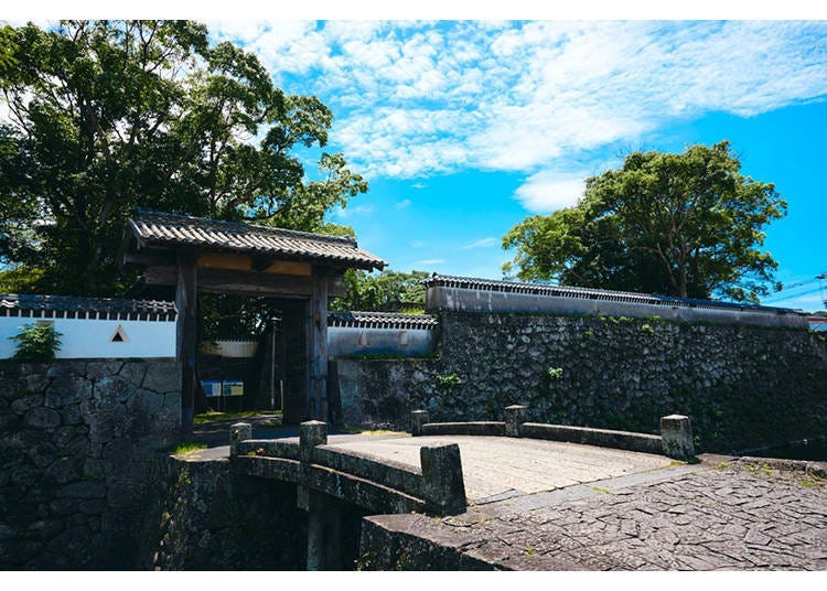 福江島に14時50分に到着したら、五島市の市街地を見学してみましょう。福江港ターミナルから徒歩10分ほどのところに、福江藩(五島藩ともよぶ)の居城「福江城」があります。14世紀後半に五島列島を支配した五島家(古くは宇久家)は、代々、福江島を拠点として五島列島を管理していました。福江城は1872年にその役割を終えますが、大名庭園が今でもきちんと管理され、1日目に紹介した「五島観光歴史資料館」や、お城の本丸のあった場所には高校が建てられ、多くの生徒が城門をくぐり通学しています。そして福江城を中心にその周辺には武士たちが住んでいました。現在も、武家屋敷通りとして、当時のたたずまいのまま保存されており、屋敷を取り囲む高い石垣や、立派な門を見ることができます。