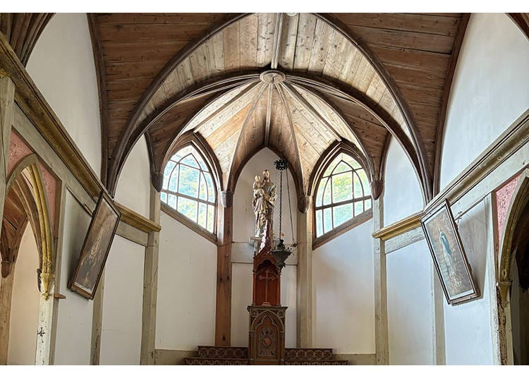 五島市内の教会を更に見たいと思うのであれば、島の北側にある「水ノ浦教会」をおすすめします。木造の教会堂としては日本で最大規模を誇り、青空に尖塔がそびえる光景は絵になる美しさで、五島市を代表する教会の一つです。