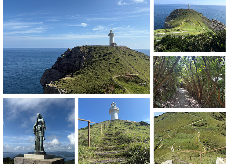 そして高浜海水浴場から車で約50分、ついに五島市福江島で最も西に位置する「大瀬崎灯台」の展望台に到着します。海に突き出た断崖絶壁の上に建つ白い灯台の景色は、青い海とのコントラストが美しく、いつまでも眺めていられる絶景です。灯台のすぐ近くまで行きたい場合は、駐車場に車を止め、徒歩で向かわなくてはなりません。展望台の駐車場から灯台までは、断崖絶壁に整備された遊歩道をひたすら下り、徒歩20分ほどで到着します。高台に建つ灯台は、遠く展望台から見るより巨大で、その雄姿に圧倒されます。また海に突き出た半島からの眺めは、まさに絶景そのもので、雄大で遮るものがなく、これより西には中国大陸までただ海が続いていると思うと、かつてこの地から中国に向けて船で旅立った人々の不安や、新天地に向かう希望が入り混じった不思議な感覚を体験することができます。