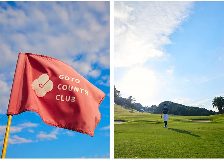 鬼岳を楽しむアクティビティとして、ゴルフはいかがでしょうか。鬼岳の麓に広がる五島カントリークラブでは本格的なゴルフを楽しめます。最大の魅力は、その眺望にあります。ほとんどのホールから、コバルトブルーの美しい海が一望できるだけでなく、緑の絨毯を敷き詰めたような鬼岳の雄大な姿を常に感じながらプレーできます。海と山、両方の絶景を同時に楽しめる、五島ならではの贅沢な環境です。特に海に向かってティーショットを打つ爽快感は格別。心も体もリフレッシュできることでしょう。またクラブハウスレストランでは、ゴルフをしない方の利用も可能で、五島牛や新鮮な魚介類を使った料理など、地元ならではの美味しい料理が揃っています。