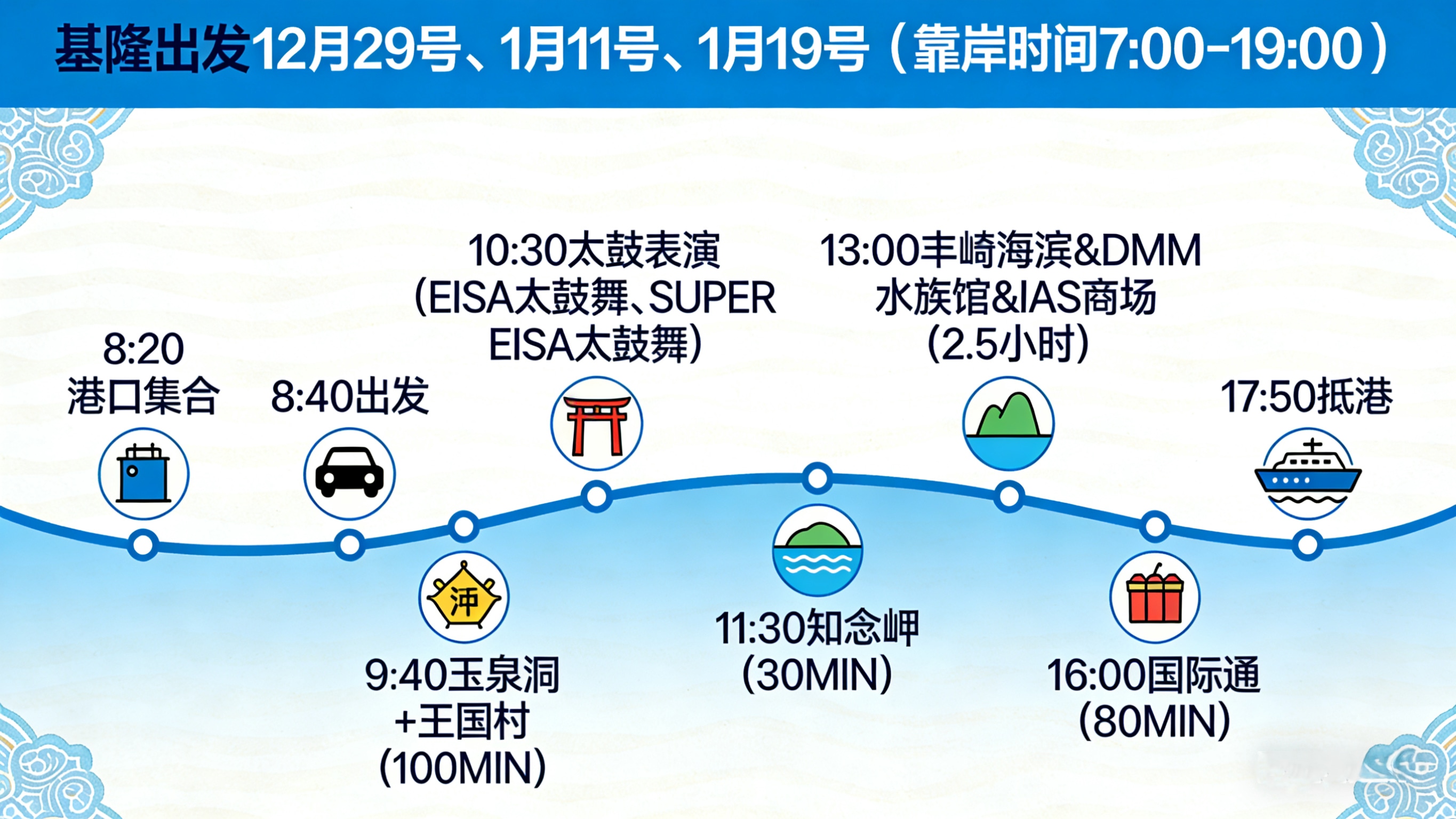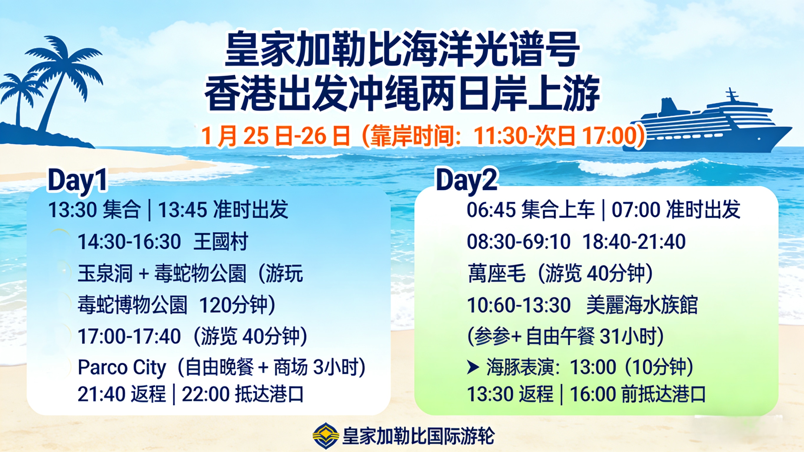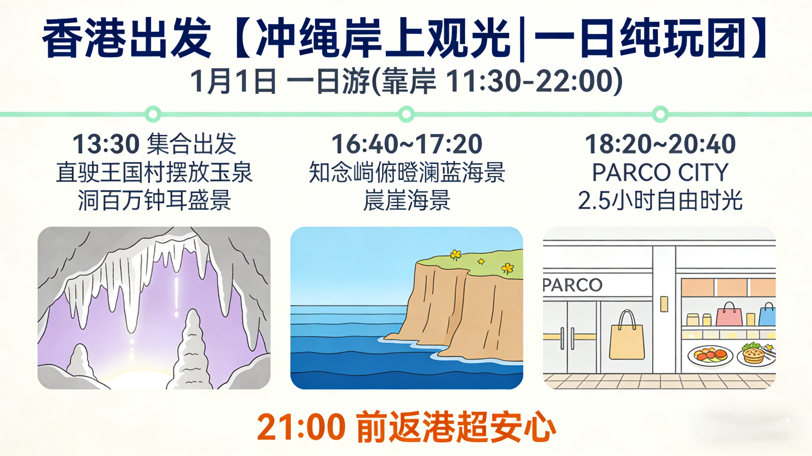 ## 基隆発【沖縄ショアエクスカーション|日帰り純粋ツアー】 12月29日、1月7日、1月11日、1月19日、(寄港時間7:00~19:00) • 8:20港内で集合して乗車、8:40出発 • 9:40分に玉泉洞+王国村に到着、100分見学 • 10:30太鼓ショー:躍動感あふれる雄壮な伝統芸能「EISA太鼓舞」ショー、一番人気のショー「SUPER EISA太鼓舞」。 • 11:20出発、11:30知念岬に到着、30分観光 • 12:00出発、13:00豊崎海浜&DMM水族館&IASショッピングモールに到着、自由な昼食+観光時間2.5時間; 15:30出発、16:00国際通りに到着、自由なCITYWALK約80分 • 17:20帰港、17:50港に到着 ## 香港発【沖縄ショアエクスカーション|日帰り純粋ツアー】 1月1日 日帰りツアー(寄港 11:30-22:00) • 13:30 集合出発、王国村へ直行し、玉泉洞の百万本の鍾乳石の絶景を探訪、琉球文化の魅力を感じます。 • 16:40~17:20知念岬から紺碧の海を俯瞰し、最高の海岸風景を捉えます。 • 18:20~20:40 PARCO CITY 2.5時間の自由時間、地元のグルメとショッピングを楽しみます • 21:00 前に帰港するので超安心。 ## 香港発【沖縄ショアエクスカーション|2日間純粋ツアー】 1月25-26日2日間ツアー(寄港11:30~翌日17:00) 1日目: • 13:30集合、13:45出発 • 14:30-16:30王国村+玉泉洞+ハブ博物公園、120分遊ぶ • 17:00-17:40知念岬、40分観光 • 18:40-21:40、PARCO CITY自由夕食+ショッピング3時間 • 21:40帰路、22:00港に戻る 2日目: • 6:45集合乗車、7:00出発 • 8:30-9:10万座毛に到着、40分見学 • 10:30-13:30美ら海水族館、見学+自由昼食3時間(イルカショー10分、13:00) • 13:30帰路、16:00前に港に到着