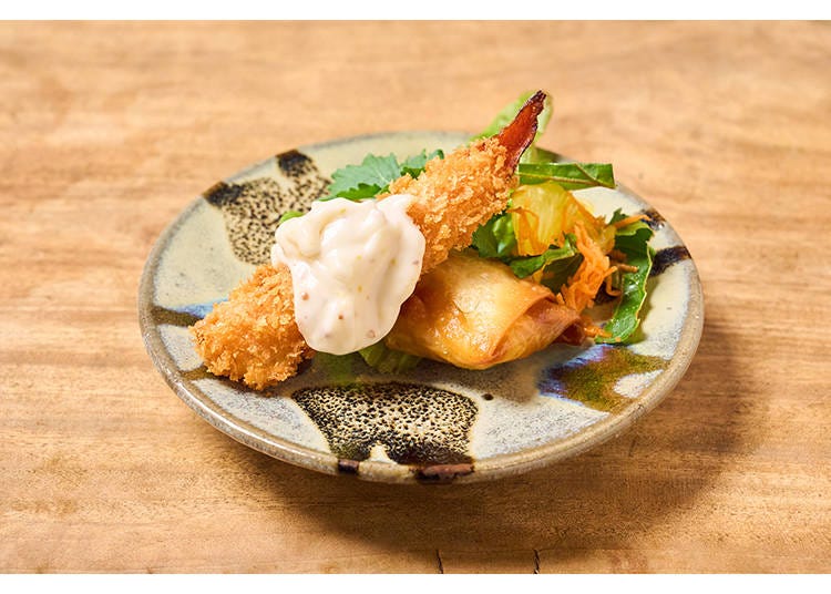 エビフライに見えるこの料理はなんとニンジンのフライ。目でも楽しめる一皿。