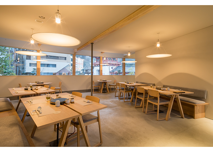 武雄温泉本店は、佐賀の豆腐文化を発信する佐嘉平川屋のフラッグシップストアです。レストランでは温泉湯豆腐のコース料理を、カフェでは豆乳スイーツを提供。中庭の足湯に浸かりながら楽しめるのも魅力です。食の制限がある人にも配慮したベジタリアン向けメニューを用意しています。