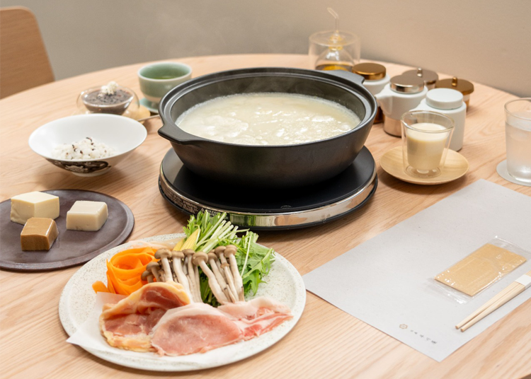 温泉湯豆腐御膳(3,500円)。県産大豆フクユタカを使用し、温泉成分に似せた調理水で仕上げた、豆腐の旨みと濃厚さを味わえる。塩やオリーブオイルで楽しめる内容。