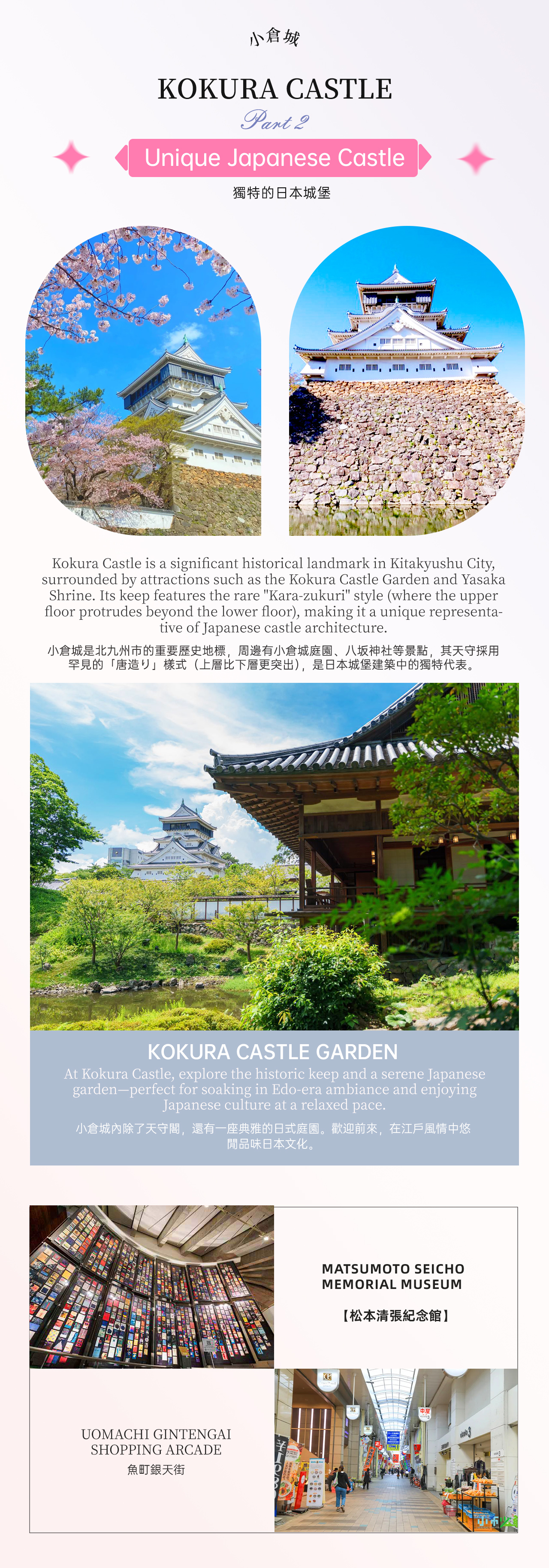 - ※小倉城は歴史と建築の美しさが融合し、庭園も四季折々の美しさを誇ります。