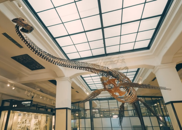 3Fに展示された巨大なフタバスズキリュウの復元骨格は、まさに圧巻の一言。恐竜時代の海を支配したとされるこの生き物の迫力は見る者を圧倒します。また、日本最大級のアンモナイトコレクションや鉱物コレクション、日本に落下した隕石も展示されています。