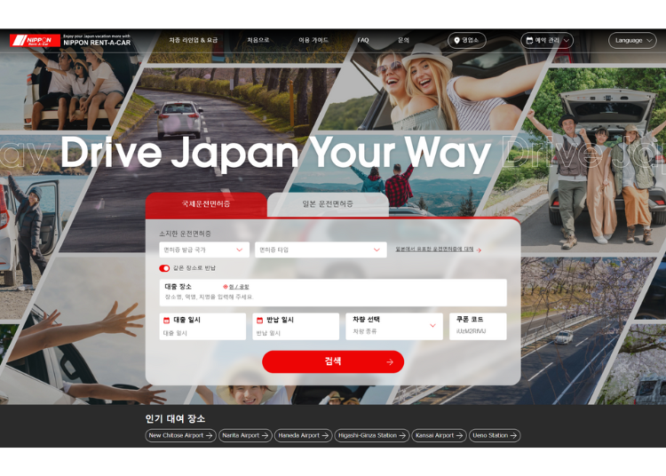 일본 전국을 망라하는 영업소 네트워크 주요 공항(하네다 공항, 나리타 공항, 간사이 국제공항, 신치토세 공항, 후쿠오카 공항, 나하 공항 등)은 물론, 신칸센 정차역(도쿄역, 시나가와역, 나고야역, 교토역, 신오사카역, 신고베역, 히로시마역, 하카타역 등) 바로 근처에는 어김없이 닛폰 렌터카의 빨간 간판이 있습니다. '공항에 도착하자마자 바로 출발', '신칸센으로 이동해 역에서부터는 차로 관광'과 같은 매끄러운 이동이 가능합니다. 닛폰 렌터카 점포 정보는 여기.