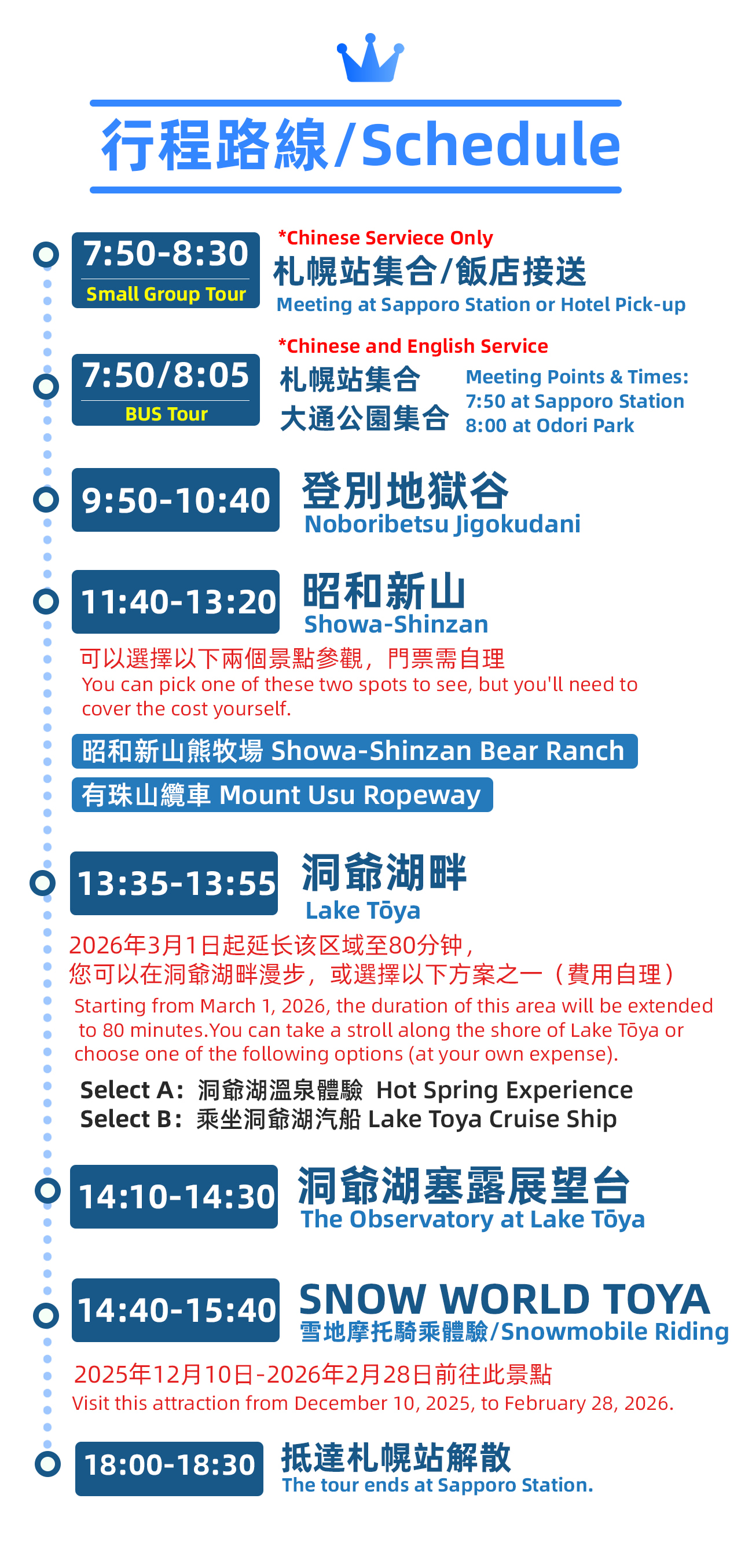 - 낭만적인 하루, 삿포로역 출발, 홋카이도 노보리베츠×도야호수 깊이 즐기기 - 노보리베츠 지옥계곡에서 대지 깊은 곳의 웅장한 에너지를 느껴보세요. 케이블카를 타고 우스산 정상에 올라 도야호수와 서태평양의 장대한 경치를 감상하세요. 또는 곰 목장에서 곰들의 일상을 가까이에서 관찰해 보세요. 더욱이 도야호수 3가지 체험(온천, 유람선, 설상 오토바이) 중에서 선택하여 홋카이도의 천국과 지옥이 어우러진 치유와 낭만을 느껴보세요. 전문 차량으로 픽업/샌딩, 두 가지 투어 선택 가능, 섬세한 9인 소규모 그룹 투어 또는 편안한 버스 투어, 홋카이도의 겨울 한정 치유와 낭만을 하루 만에 만끽하세요. 사진 애호가, 가족 단위 여행객, 또는 깊이 있는 체험을 갈망하는 여행자에게 적합합니다. ・다채로운 체험|온천, 유람선, 설상 오토바이 등 다채로운 체험 선택 가능, 홋카이도를 마음껏 누비세요. ・인싸템 인증|홋카이도 노보리베츠×도야호수의 겨울 명소를 한 번에 둘러보고 인생샷을 쉽게 찍으세요. ・삿포로 출발|유연하게 노선을 조정하여 인파를 피하고 깊이 있는 여행을 즐기세요. ・소규모 그룹 투어 선택 가능|9인 소규모 그룹 투어, 호텔 픽업/샌딩 선택 가능, 쇼핑 없는 순수 여행 입장료 및 체험 항목 비용은 불포함, 차량 비용 및 보험 포함, 점심 식사는 개별 부담, 가볍게 출발하세요! ※9인 소규모 그룹 투어에는 가이드 서비스가 포함되어 있지 않으며, 운전기사가 가이드 역할을 겸합니다! ※버스 투어에는 독립 가이드 서비스가 포함되어 있으며, 중국어, 영어, 일본어 3개 국어를 지원합니다!